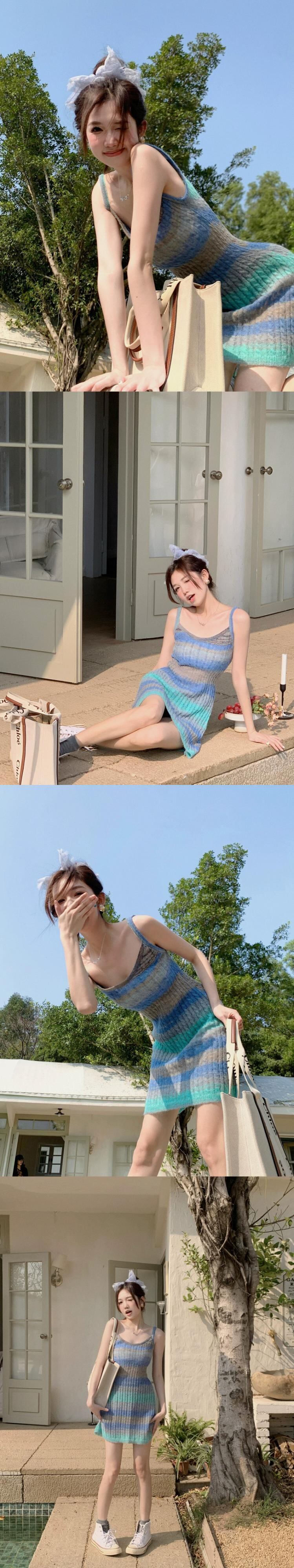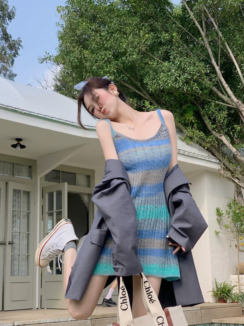ストライプニットサスペンダードレス女性の夏の 2023 新しいオールマッチシックなスリムスリムボトムショートスカート サマー 夏物 0921928291862693