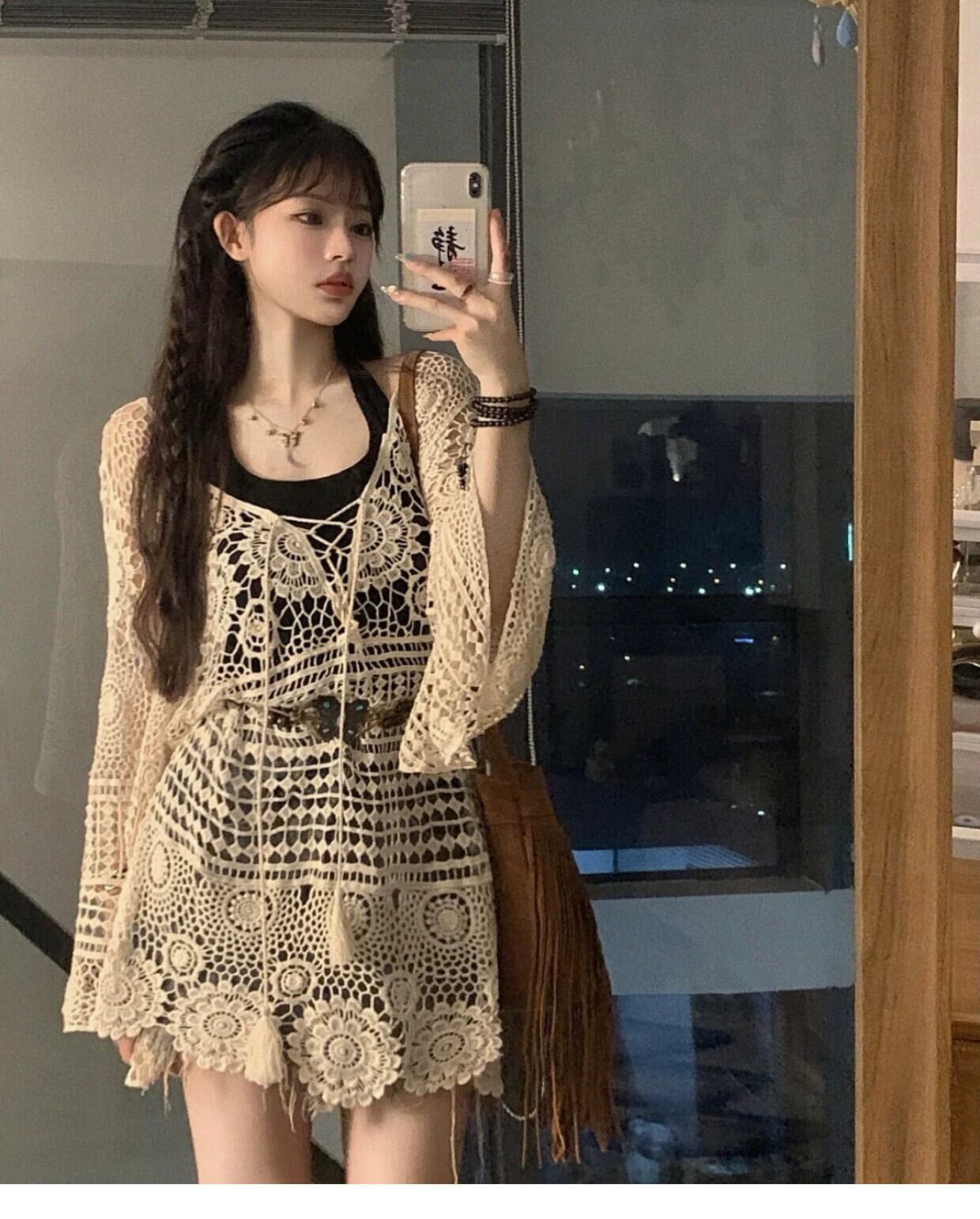 センスレトロニッチ中空長袖ニットセーターレディース 2023 春の新作ミッドレングスルーズブラウストップ ロング スプリング 春物 0921931641091126