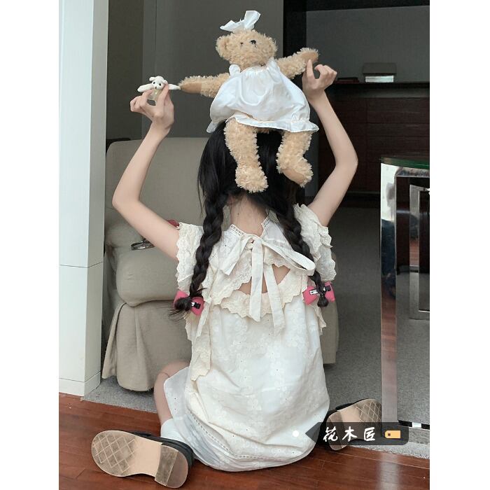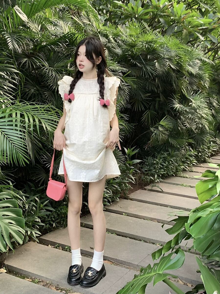 かわいい女の子甘い刺繍フライング スリーブ ドレス夏 2023 バージョン中空ルーズ A ライン スカート レッド 大人ガーリー スウィート キュート カジュアル サマー 夏物 Aライン 0921970117074860