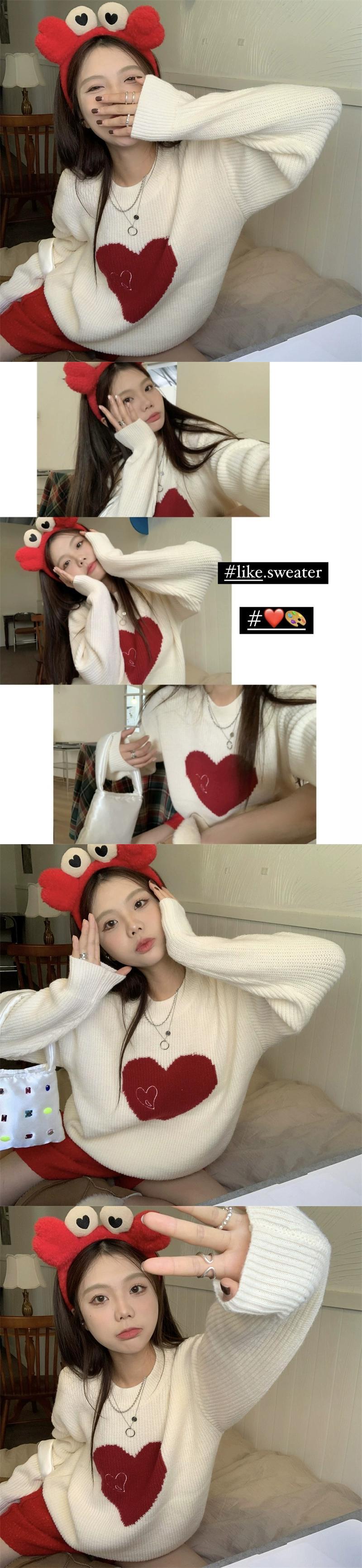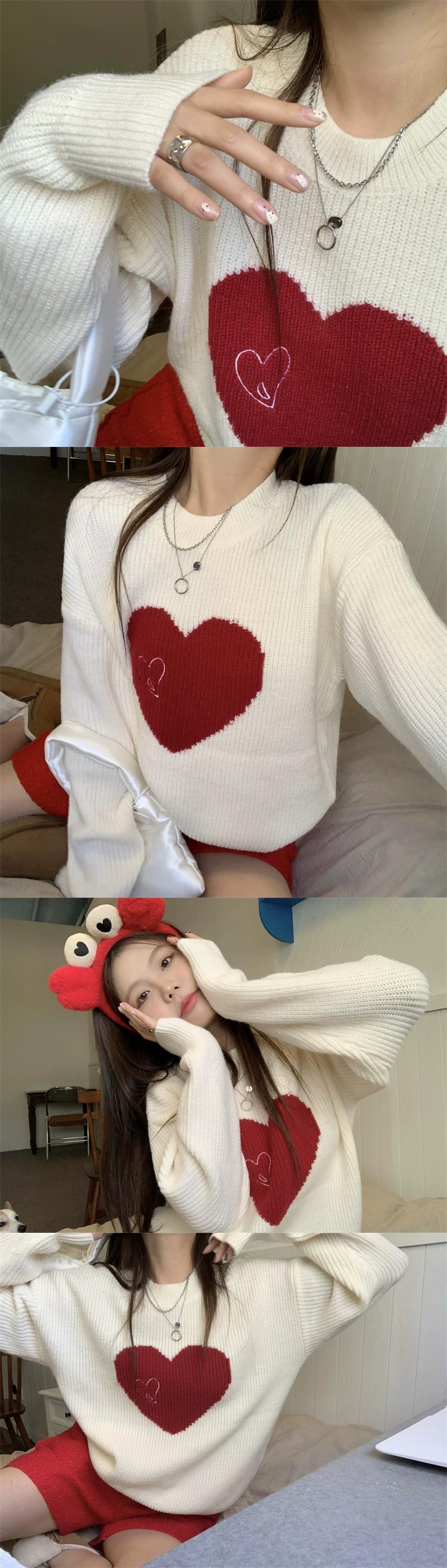 クリスマスレッドコントラストカラー愛プルオーバーセーター女性の冬 2023 新しい怠惰なスタイルルーズラウンドネックニットトップ ウィンター 冬物 Oネック 0921948119938688