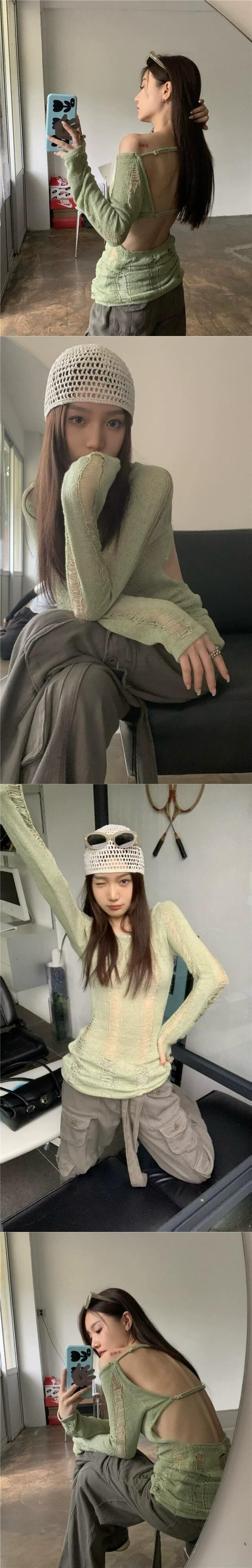 -エンド中空長袖ニットセーターレディース2023年春新作ミッドレングススリムボトムシャツトップ ロング スプリング 春物 0921955688957045