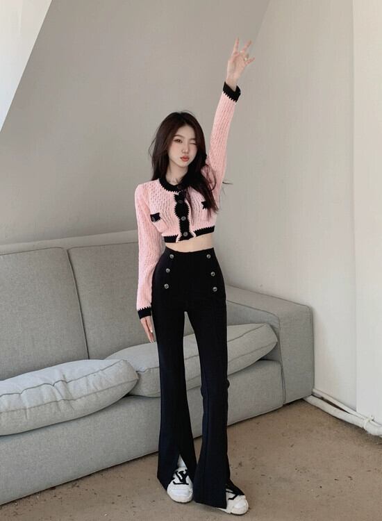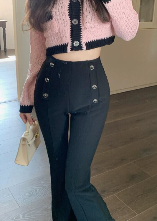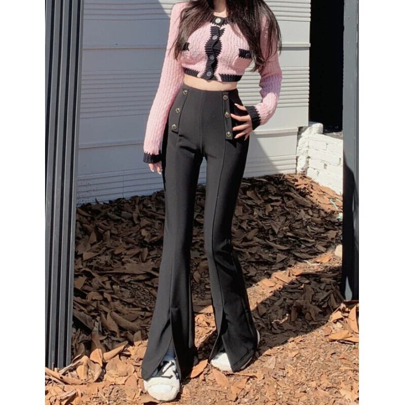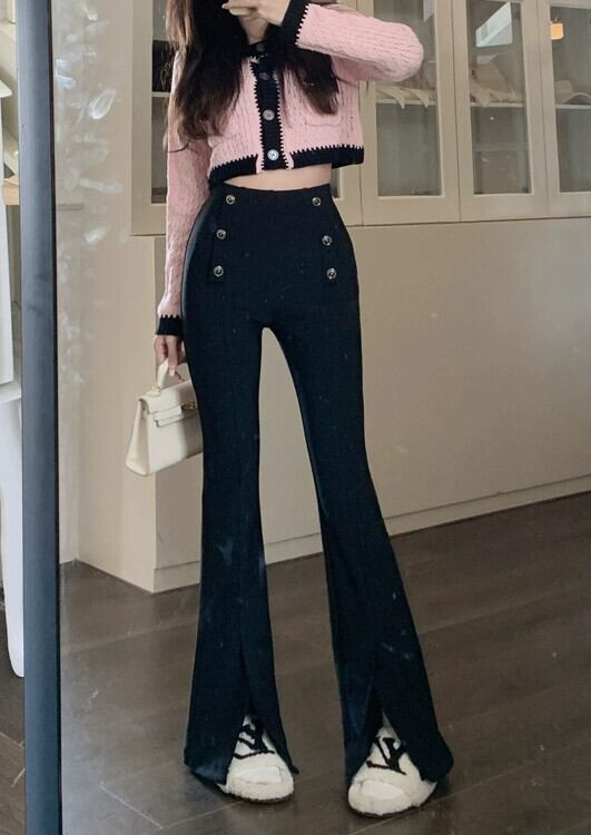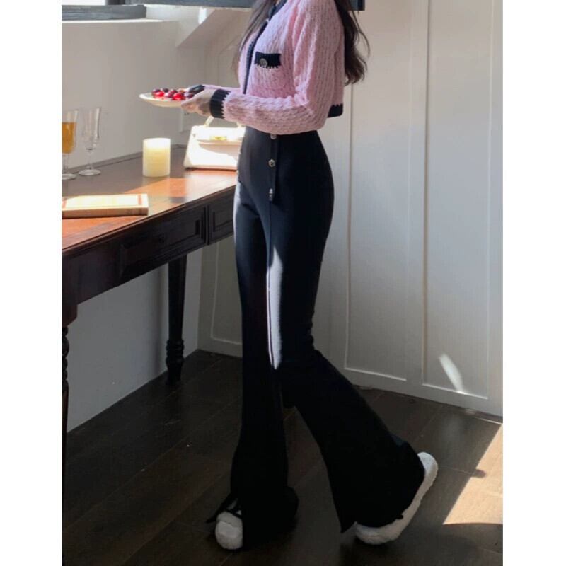 黒スリットダブルブレストプラスベルベット厚いカジュアルパンツ女性の冬の 2023 新しいハイウエストスリムマイクロラモップパンツ ブラック ウィンター 冬物 0921995579109263