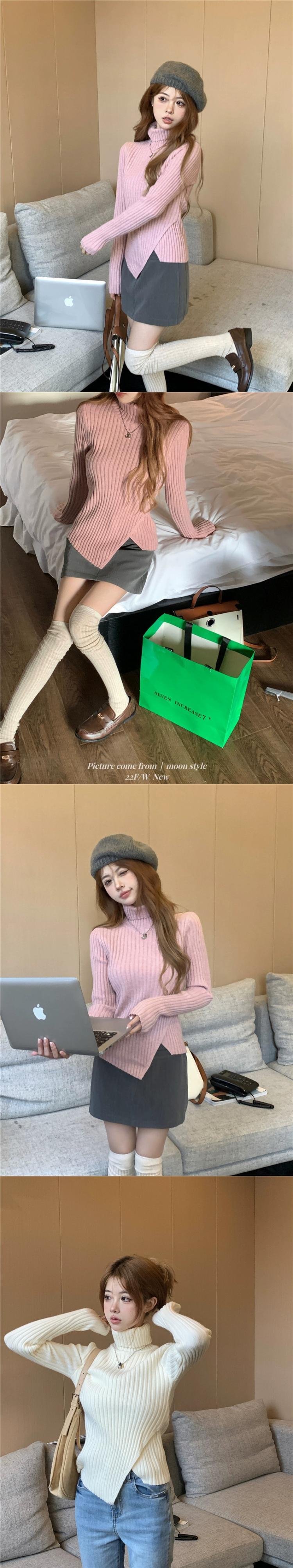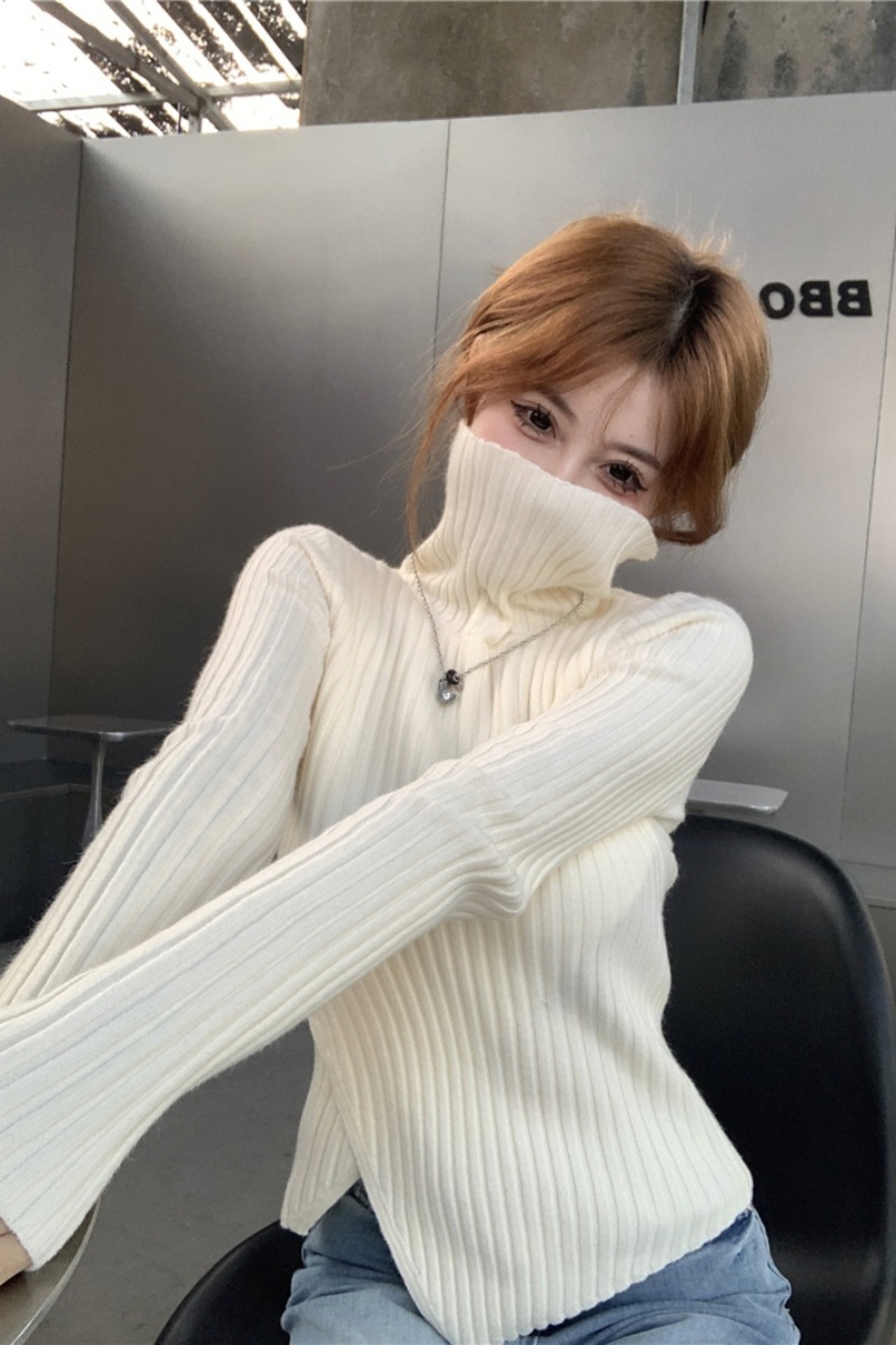 万能ベーシック無地タートルネック長袖セーターレディース2023冬新デザイン感覚スリットスリムニットトップ ロング ウィンター 冬物 ソリッドカラー 0921960821147829