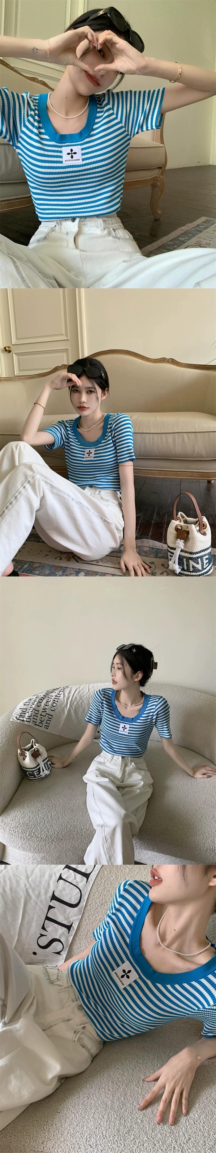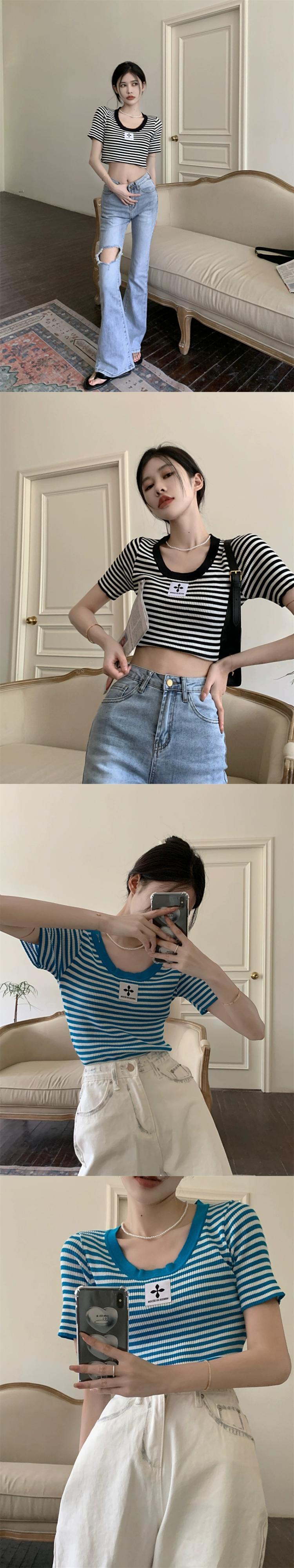 センス U ネックストライプ半袖 T シャツレディース 2023 夏の新しいスタイルシックなスリムショートトップ潮 サマー 夏物 Tシャツ 0921945972749180