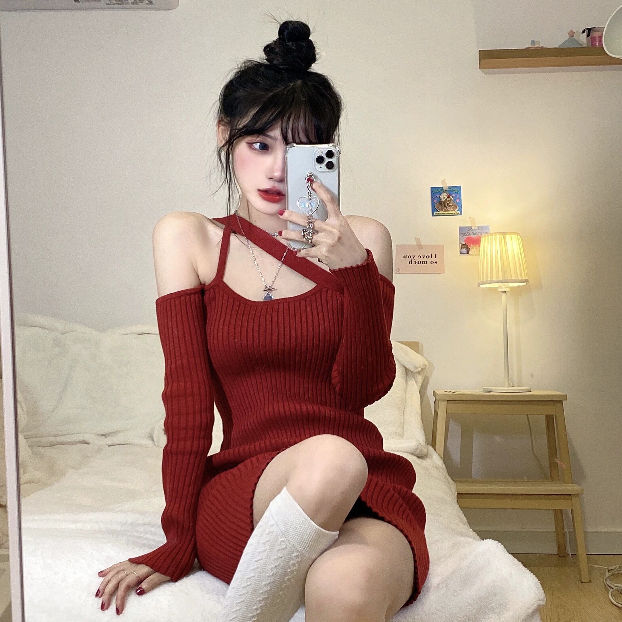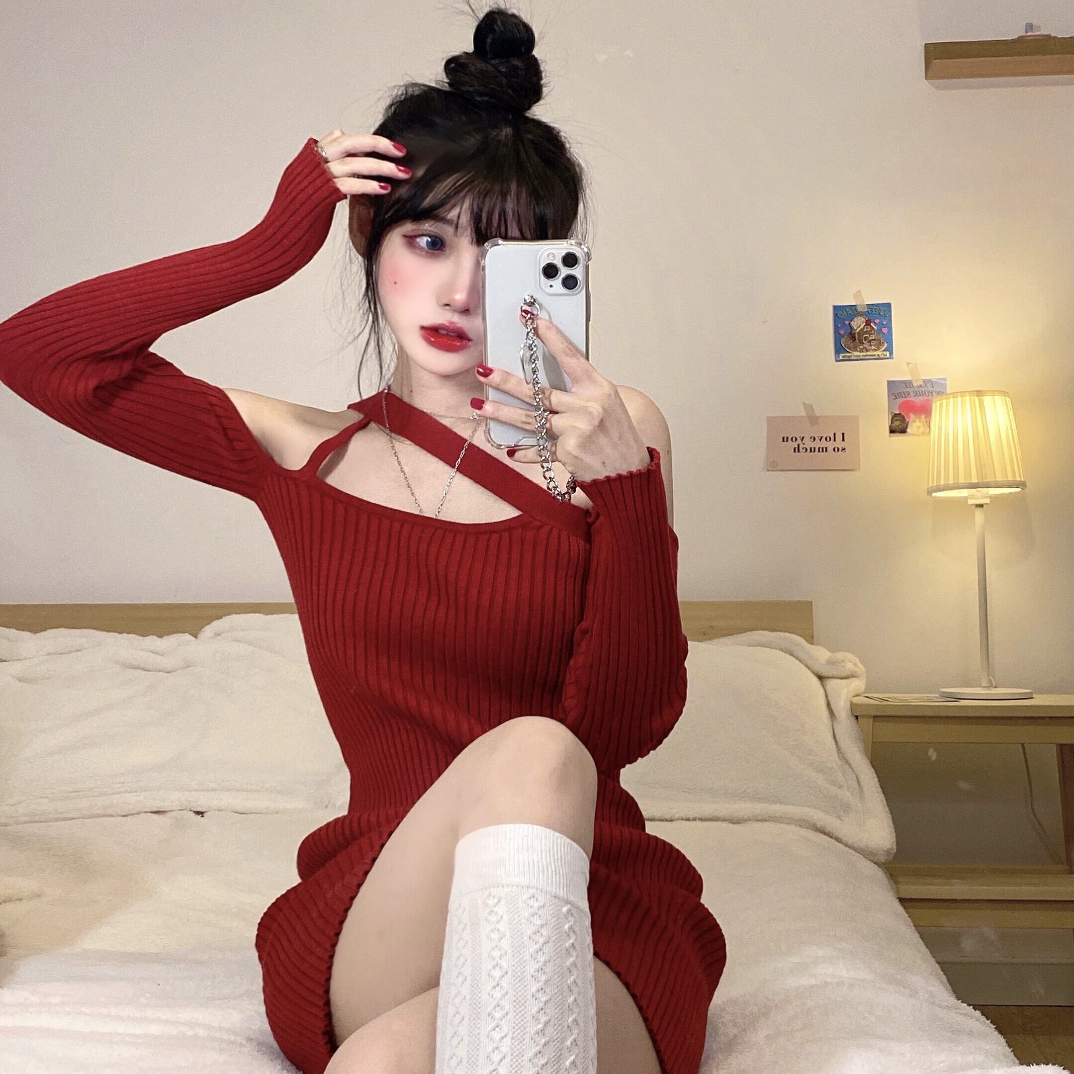純粋な欲望スタイルのセクシーなオフショルダーニットドレスの女性の春 2023 新しいウエスト痩身長袖ショートスカートヒップ ロング スプリング 春物 092194449030491