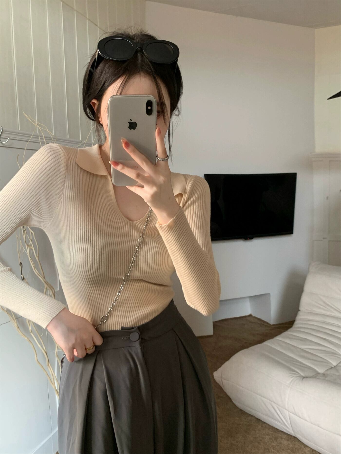 純粋な欲望シンプルな無地長袖ニットセーターレディース 2023 春の新作スリム V ネックプルオーバートップ ロング スプリング 春物 Vネック ソリッドカラー 0921919545358075