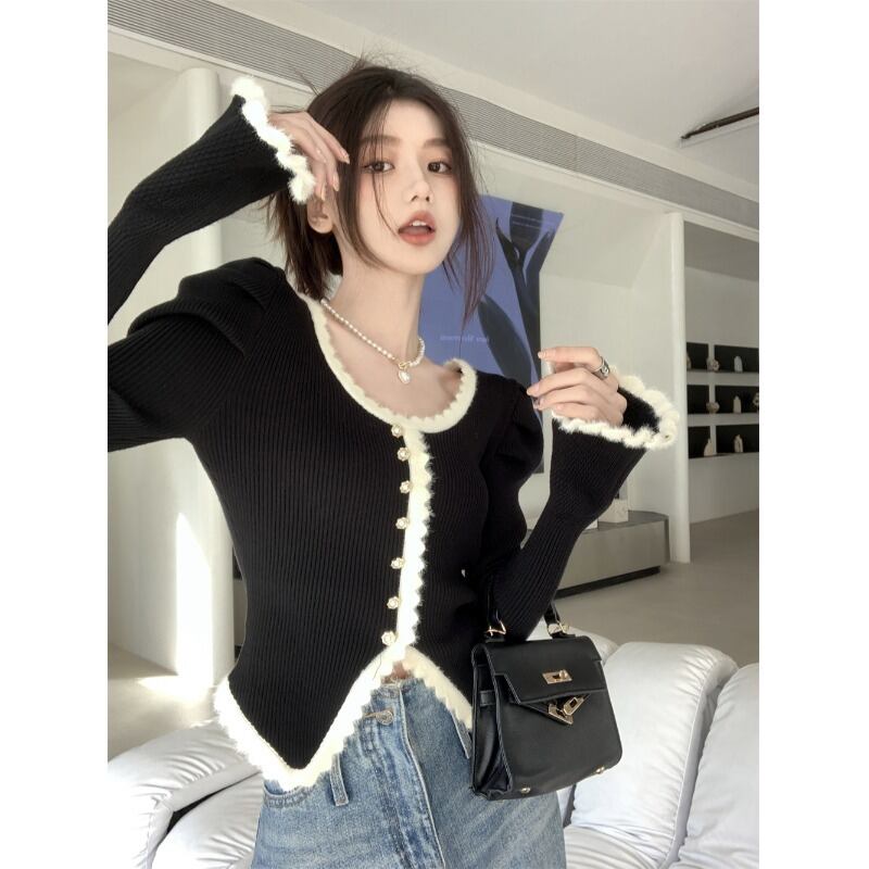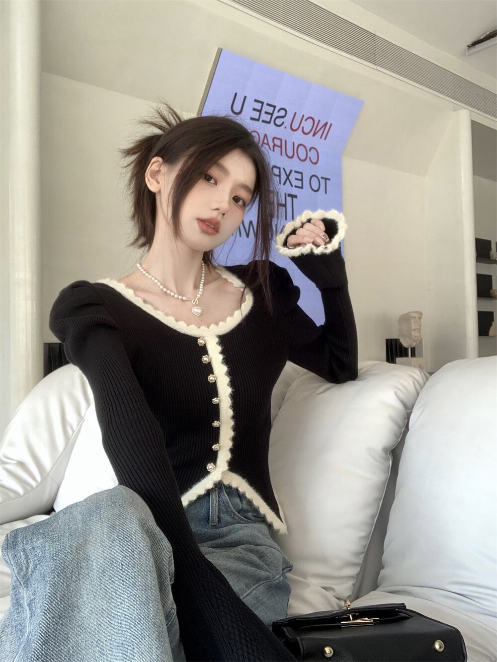 フランスのファッションカラーコントラストレースニットセーター女性の春と秋 2023 新しいショートセクションスリムスリム長袖ボトムストップ ロング スプリング 春物 オータム 秋物 0921961835513395