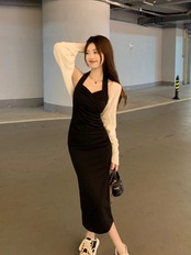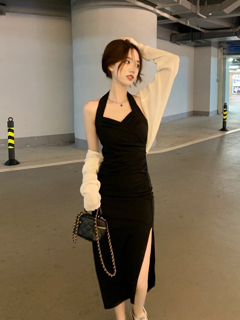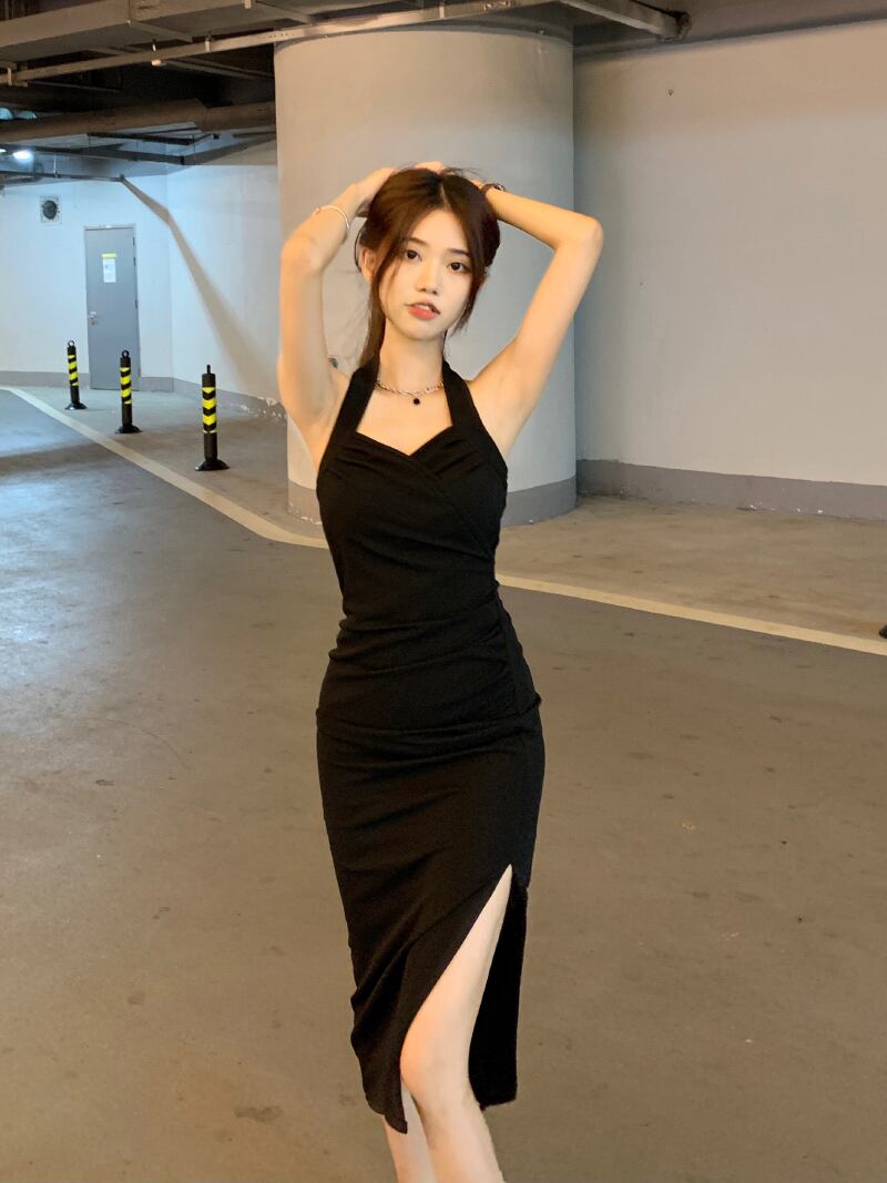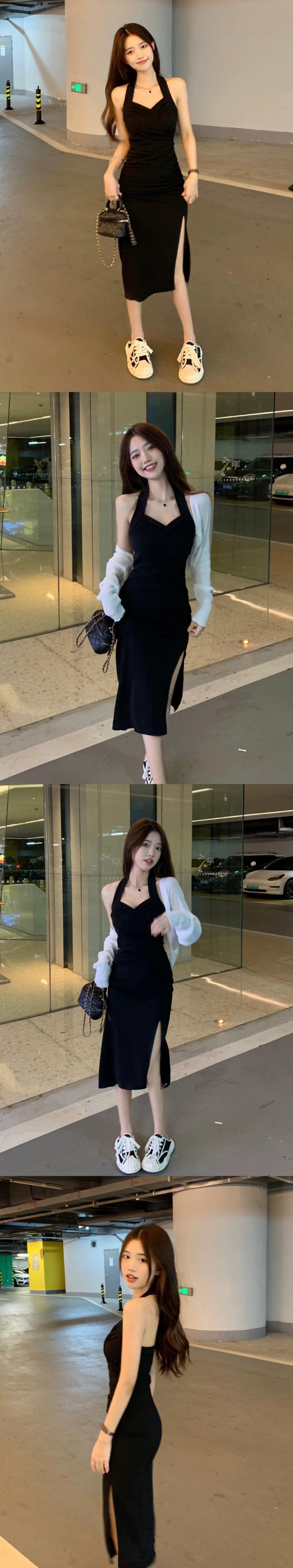 フランスの気質のぶら下げネックドレスの女性の夏の 2023 新しいミッドレングスウエスト痩身デザインセンススリットスカート サマー 夏物 092192854809818