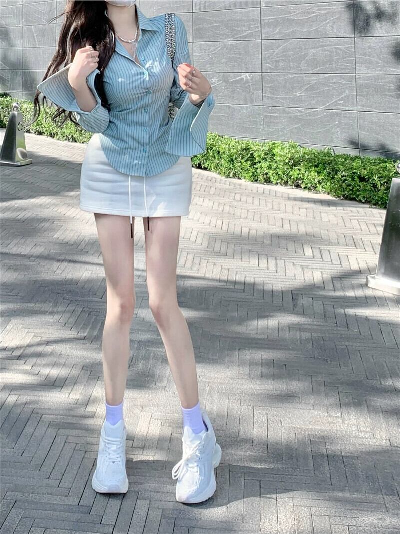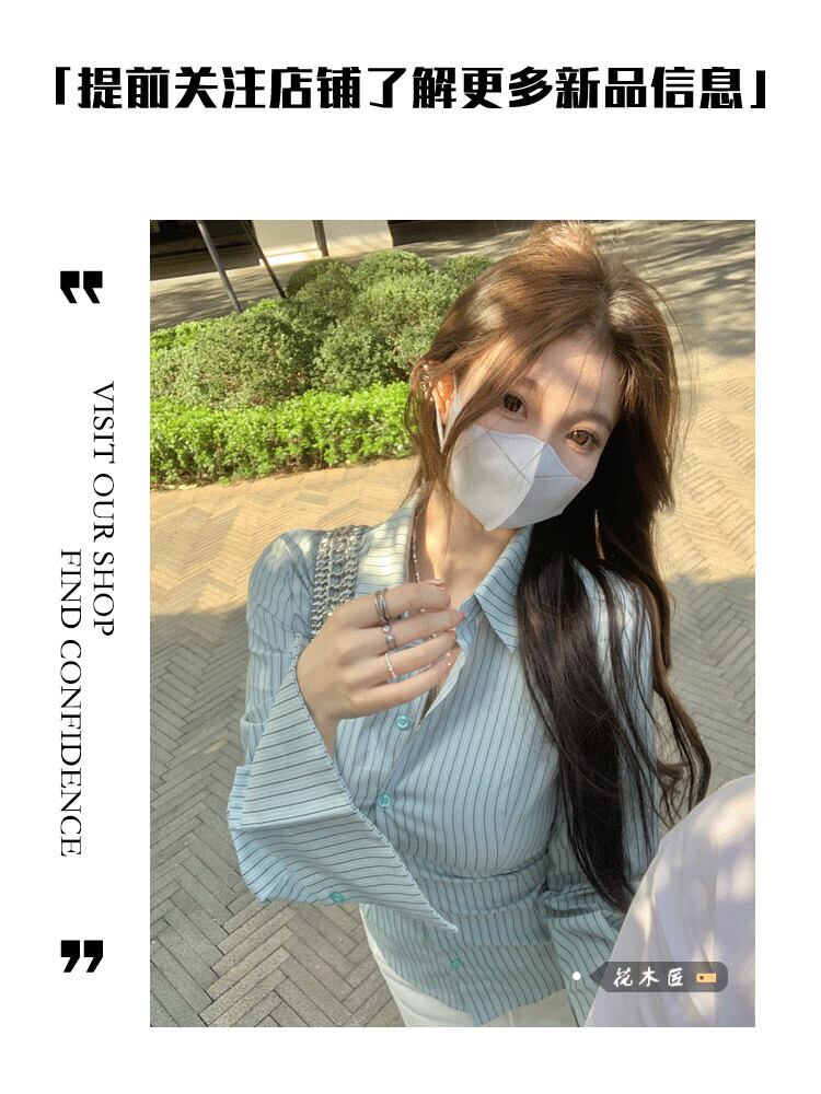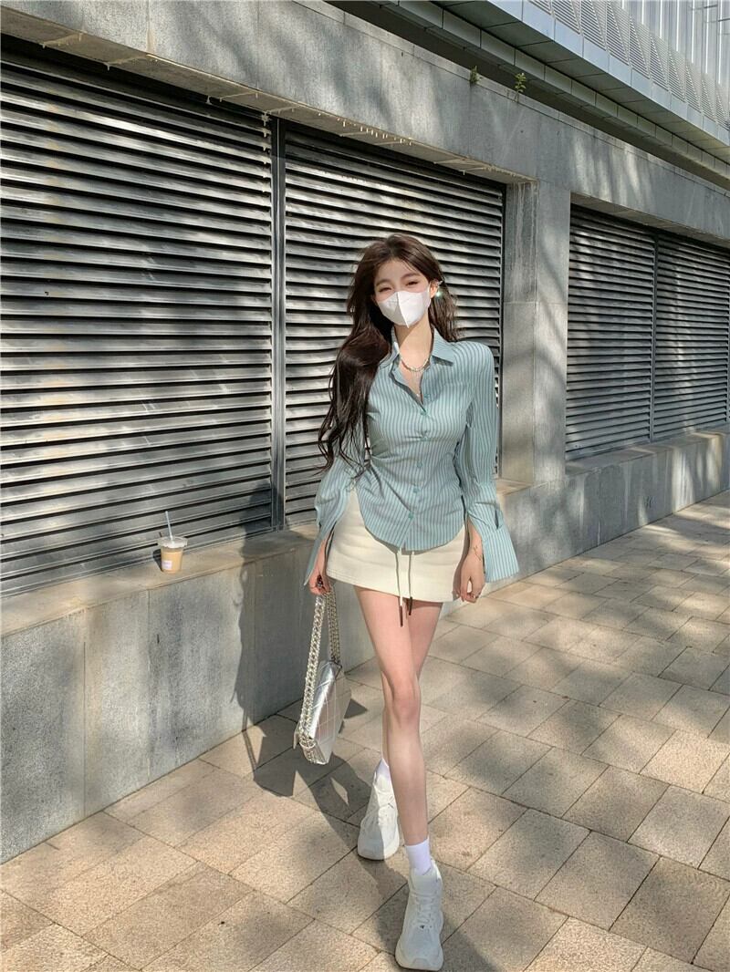 純粋な欲望スタイル気質コントラストカラーストライプ長袖シャツ女性の夏の 2023 新しいウエストラインスリムポロカラーシャツ ロング サマー 夏物 0921990840660323
