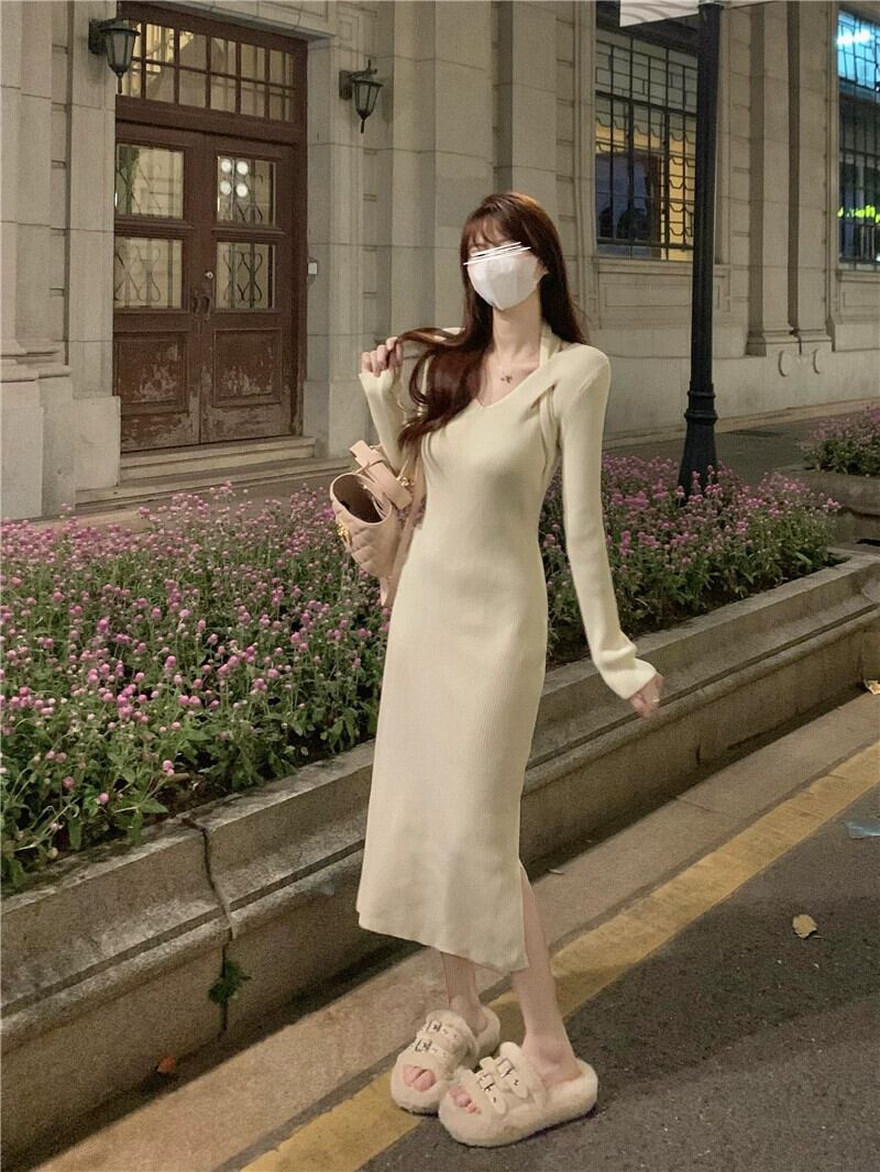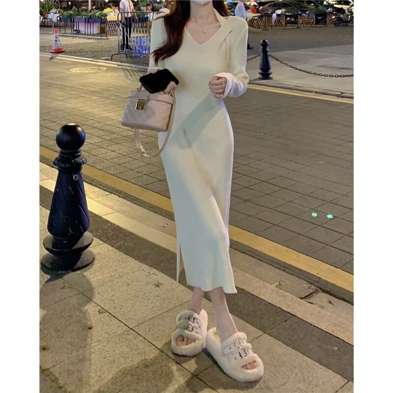 純粋な欲望を企むホルターネック長袖ドレスの女性の 2023 年春の新作スリムでスリムなミドル丈ニットスカート ロング スプリング 春物 0921947741091255