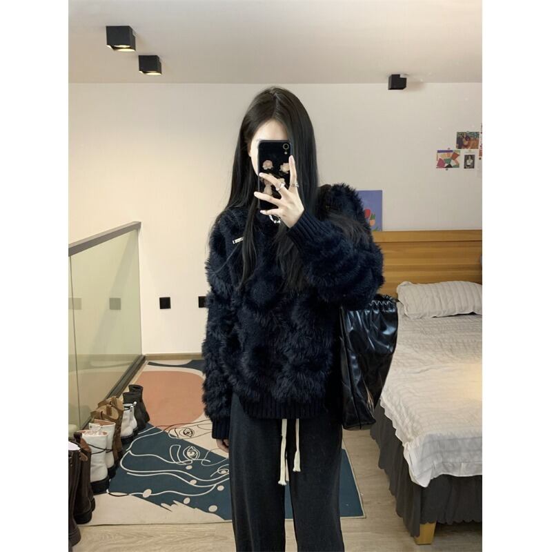 怠惰な風黒ソフトワックス状イミテーションミンクファープルオーバーセーター女性の春 2023 新しい気質ルーズオールマッチトップス ブラック スプリング 春物 0921966394028153