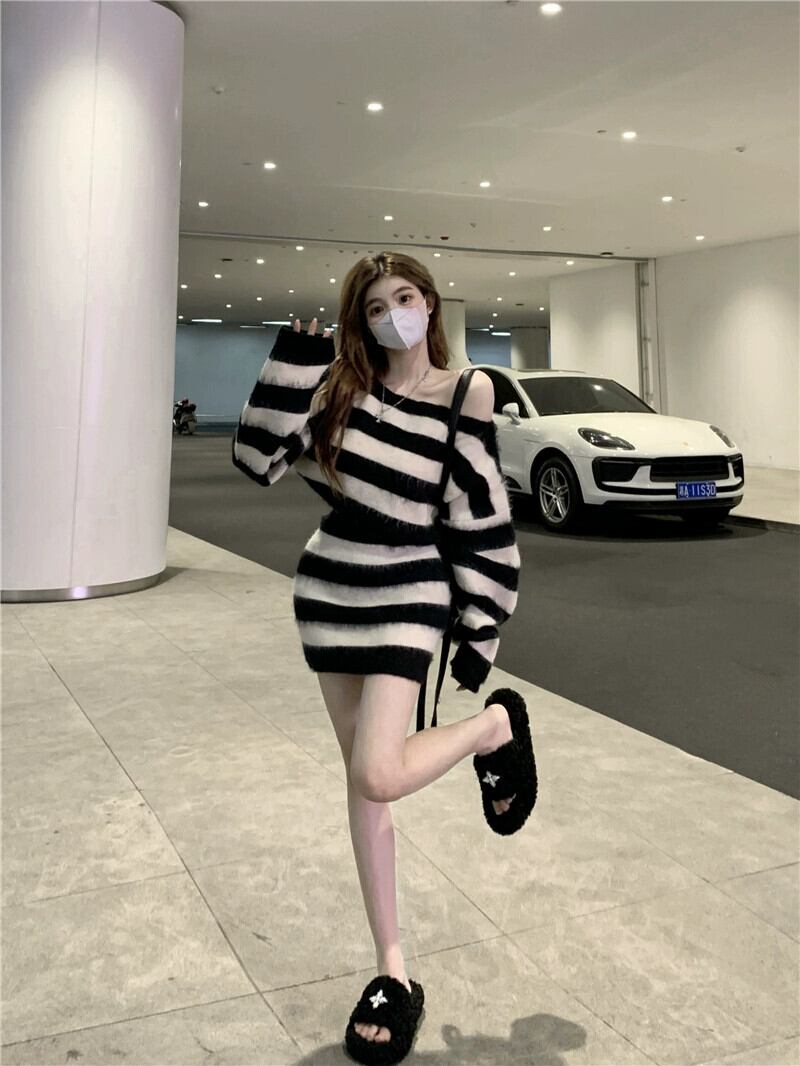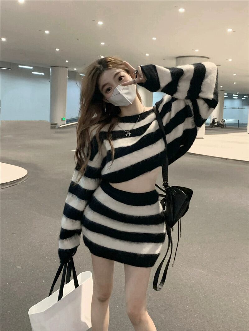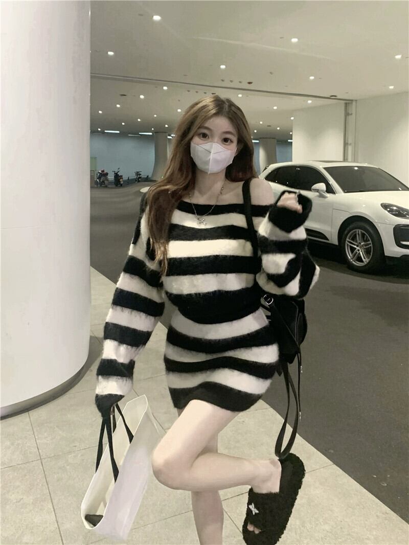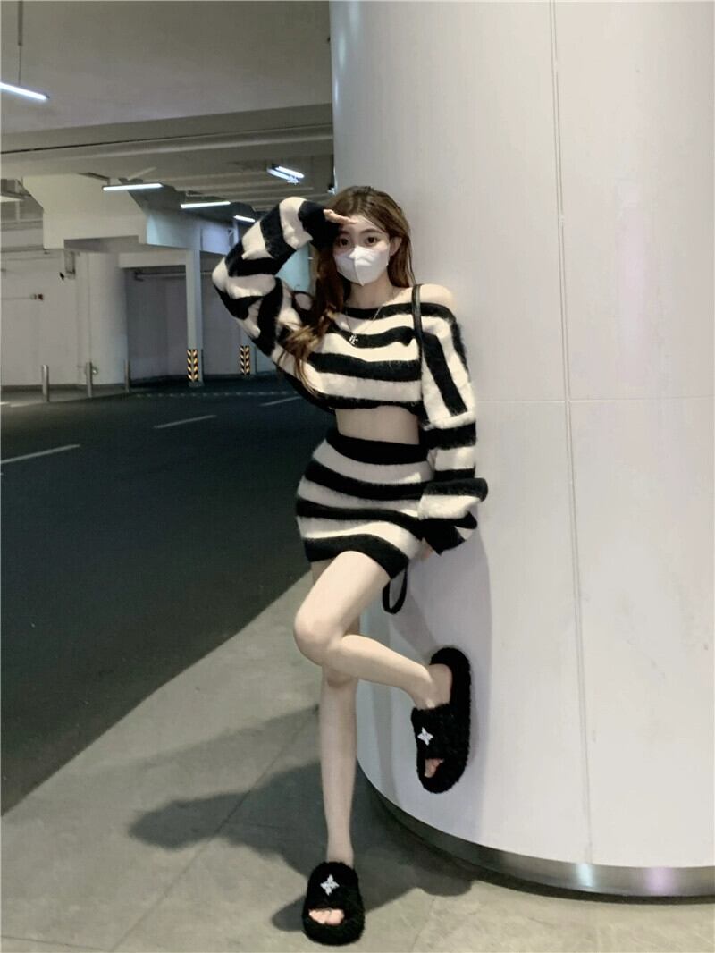 純粋な欲望風スーツ女性の春と秋の新バージョンセクシーなオフショルダーショート長袖トップストライプヒップスカートツーピースセット ロング スプリング 春物 オータム 秋物 092194622762527
