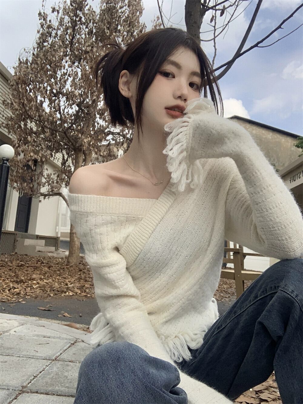 -end不規則な V ネックテル トランペット スリーブ ニット セーター レディース 2023 春の新デザイン スリム トップ スプリング 春物 Vネック 092198355211093
