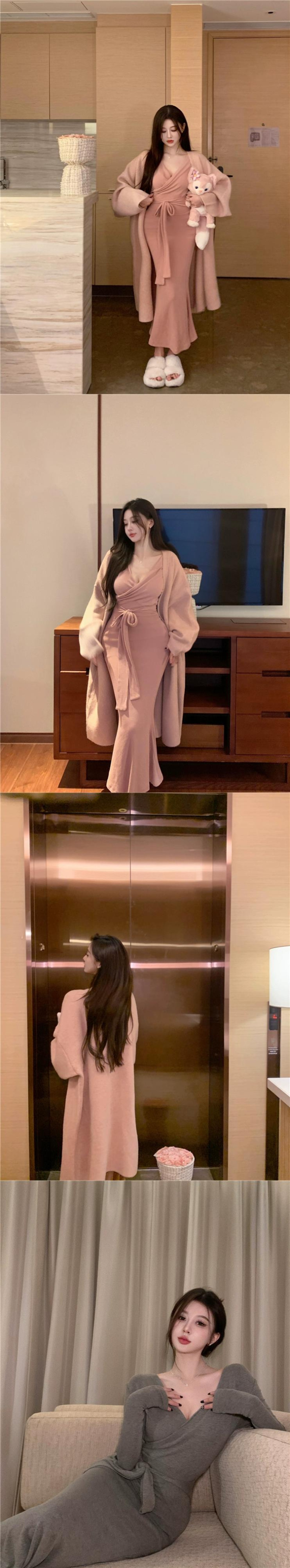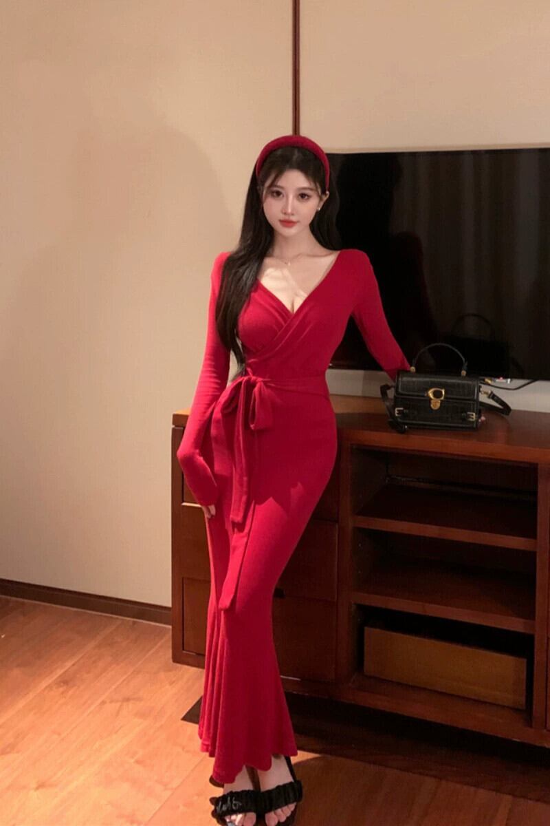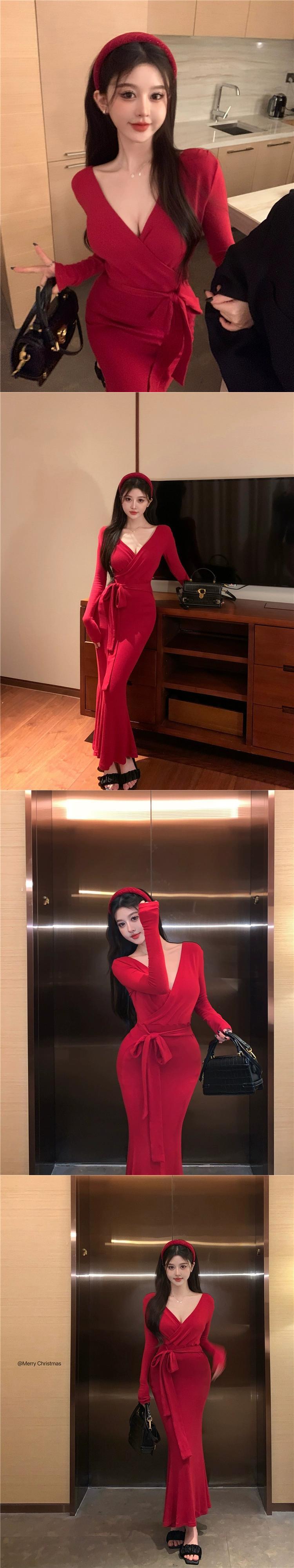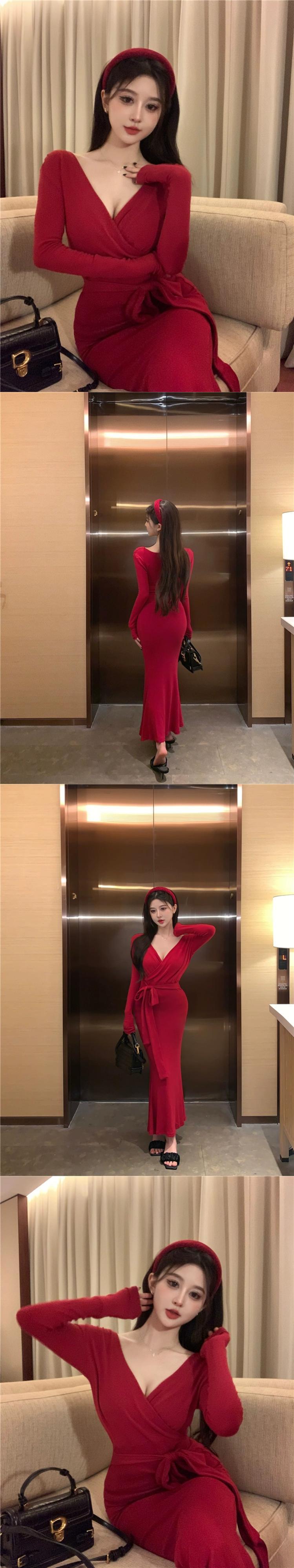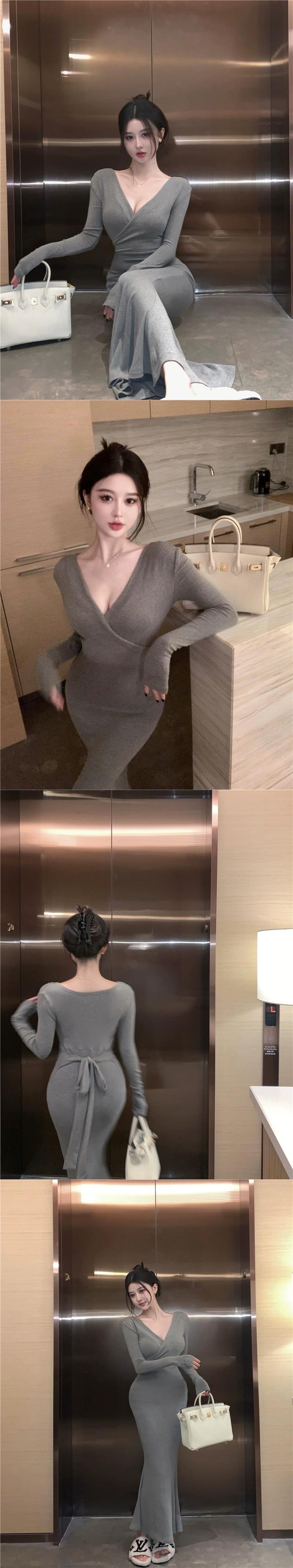 雰囲気ニットネクタイ V ネック長袖ドレス女性の 2023 春の新作スリムで薄い底マーメイドスカート ロング スプリング 春物 Vネック 0921997990004838