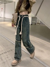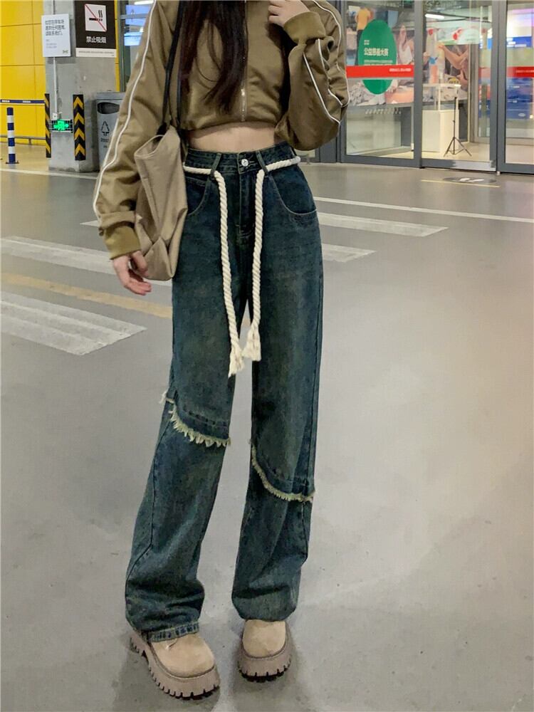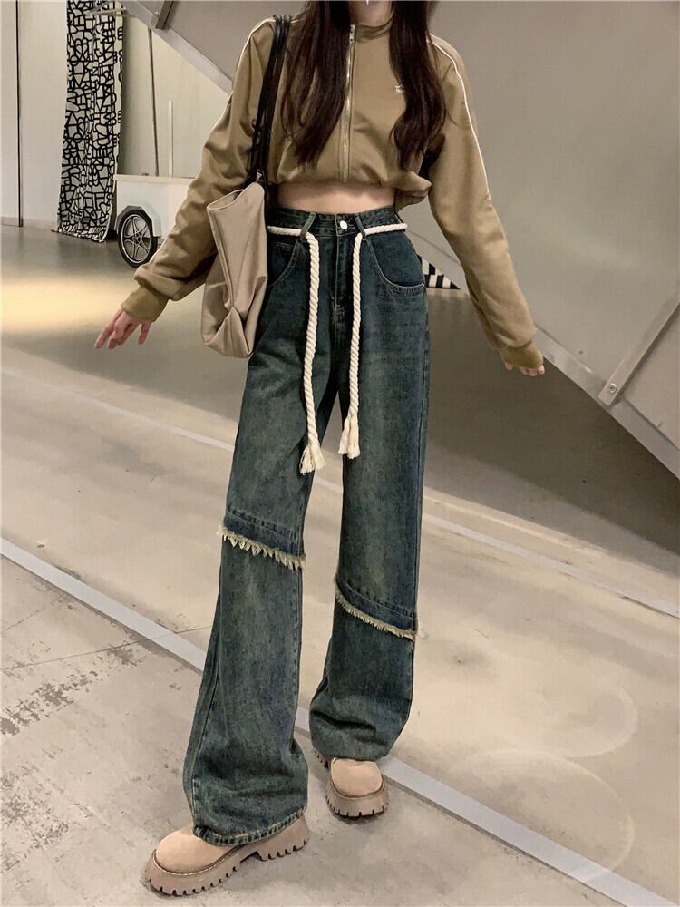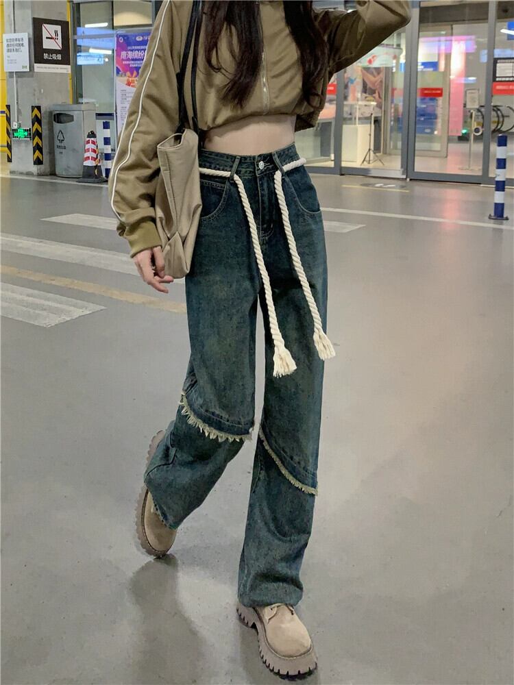 ステッチ生エッジ古いレトロジーンズ女性の夏の 2023 新しいハイウエストルーズスリムワイドレッグモップパンツ ハイウェスト サマー 夏物 ワイドパンツ 092194633449192