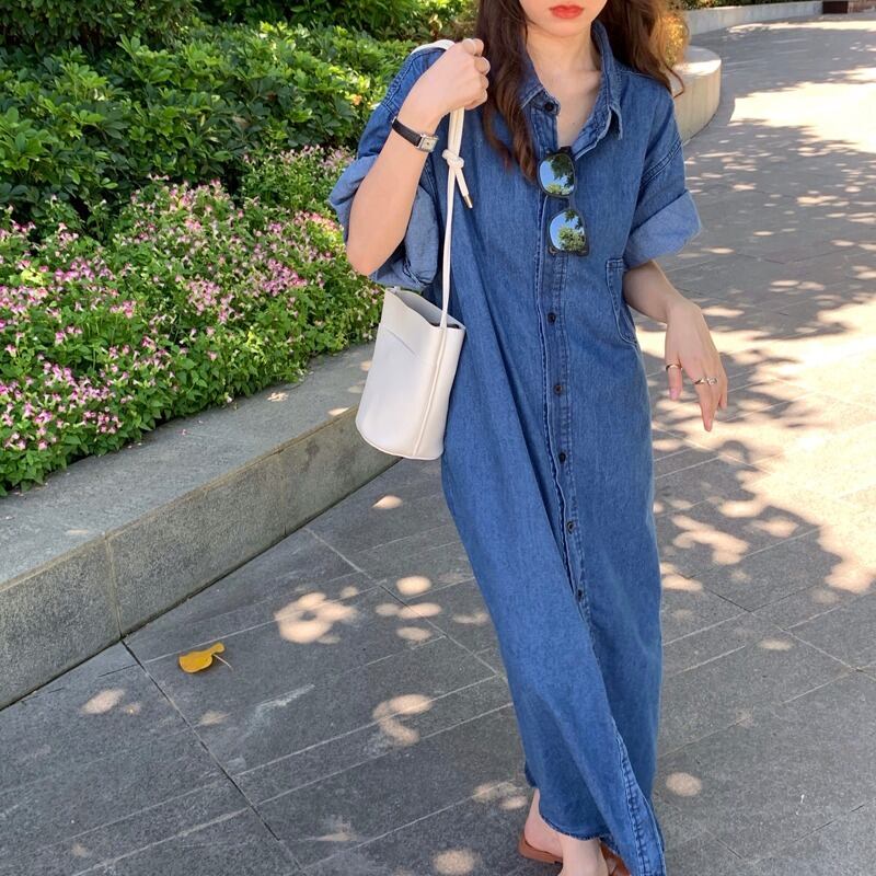 レイジースタイルデニム半袖ドレスのバージョンの女性の夏の2023新しいオールマッチシングルブレストルーズスリムスカート サマー 夏物 0921957935027712