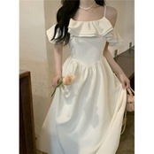 フランスの初恋スタイルのワンショルダー サスペンダー ドレスの女性の 2023 夏の新しい甘いフリル ウエスト ティー ブレーク スカート 大人ガーリー スウィート キュート カジュアル サマー 夏物 0921927419960783