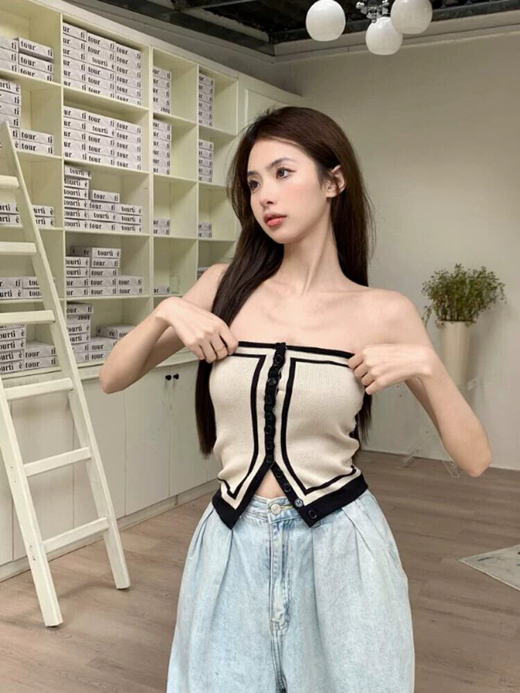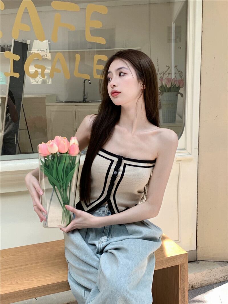 純粋な欲望のセクシーな女の子ヒットカラーチューブトップ女性の夏2023新しいデザインセンスニッチシックなショートニットベスト サマー 夏物 0921987439222603