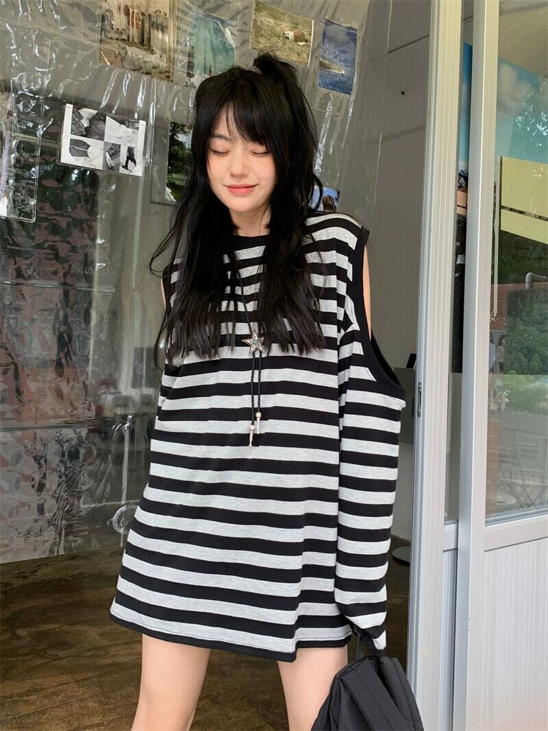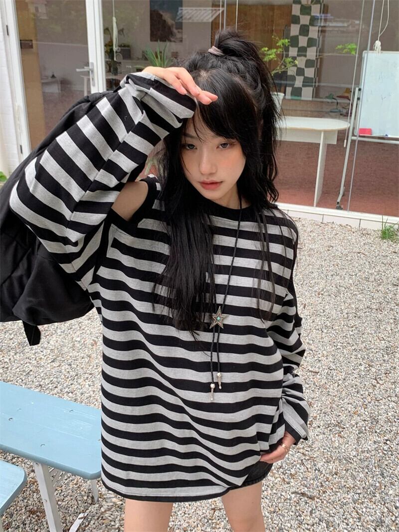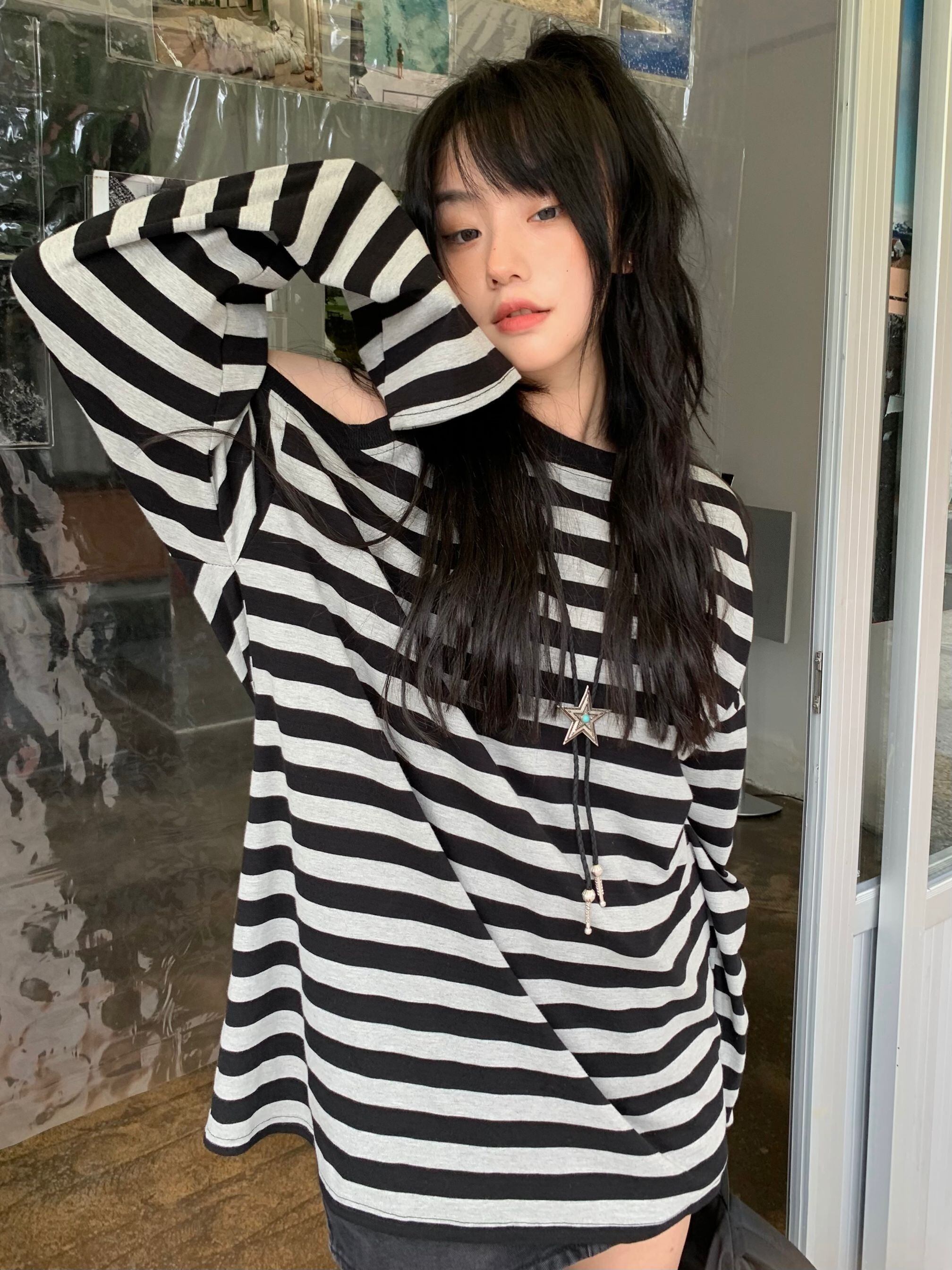 中空黒とグレーのストライプのオフショルダールーズ長袖 T シャツレディース 2023 春の新作ミッドレングススリムボトムトップ ロング ブラック スプリング 春物 Tシャツ 0921963610726078