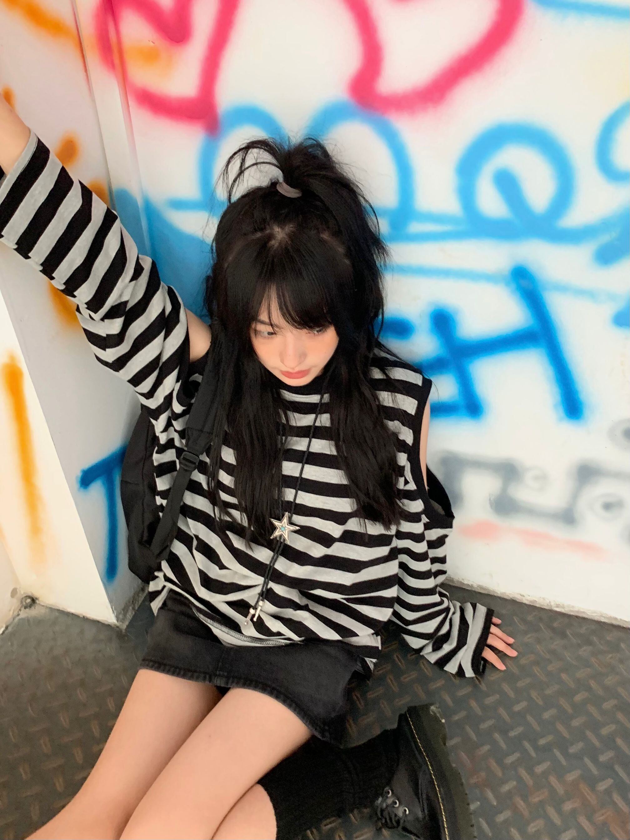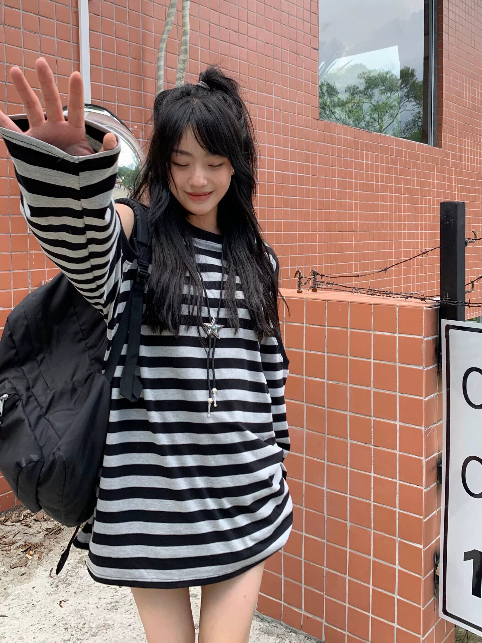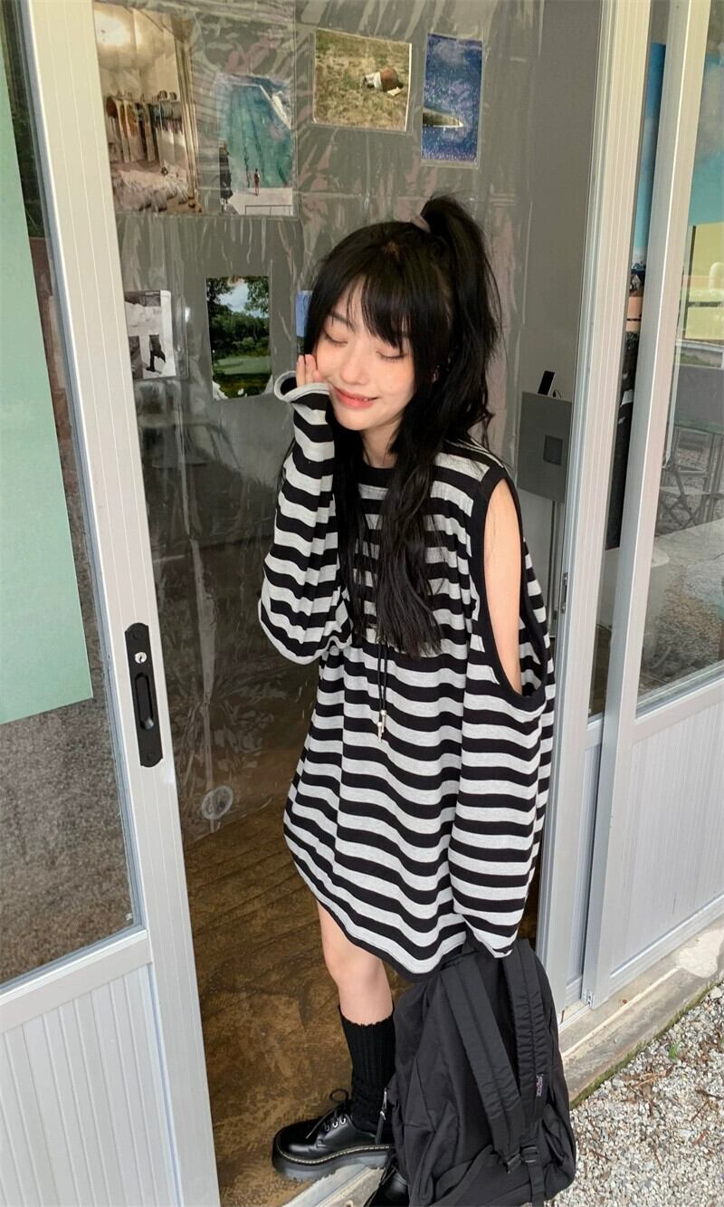 中空黒とグレーのストライプのオフショルダールーズ長袖 T シャツレディース 2023 春の新作ミッドレングススリムボトムトップ ロング ブラック スプリング 春物 Tシャツ 0921963610726078