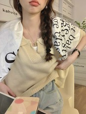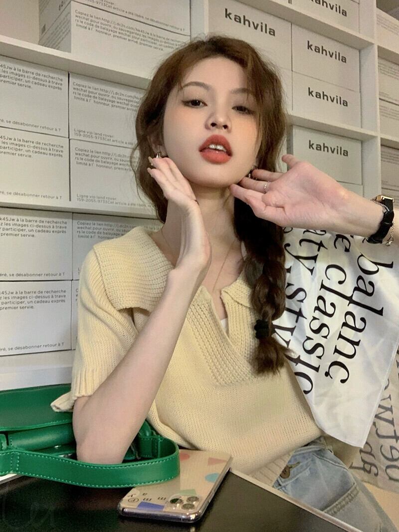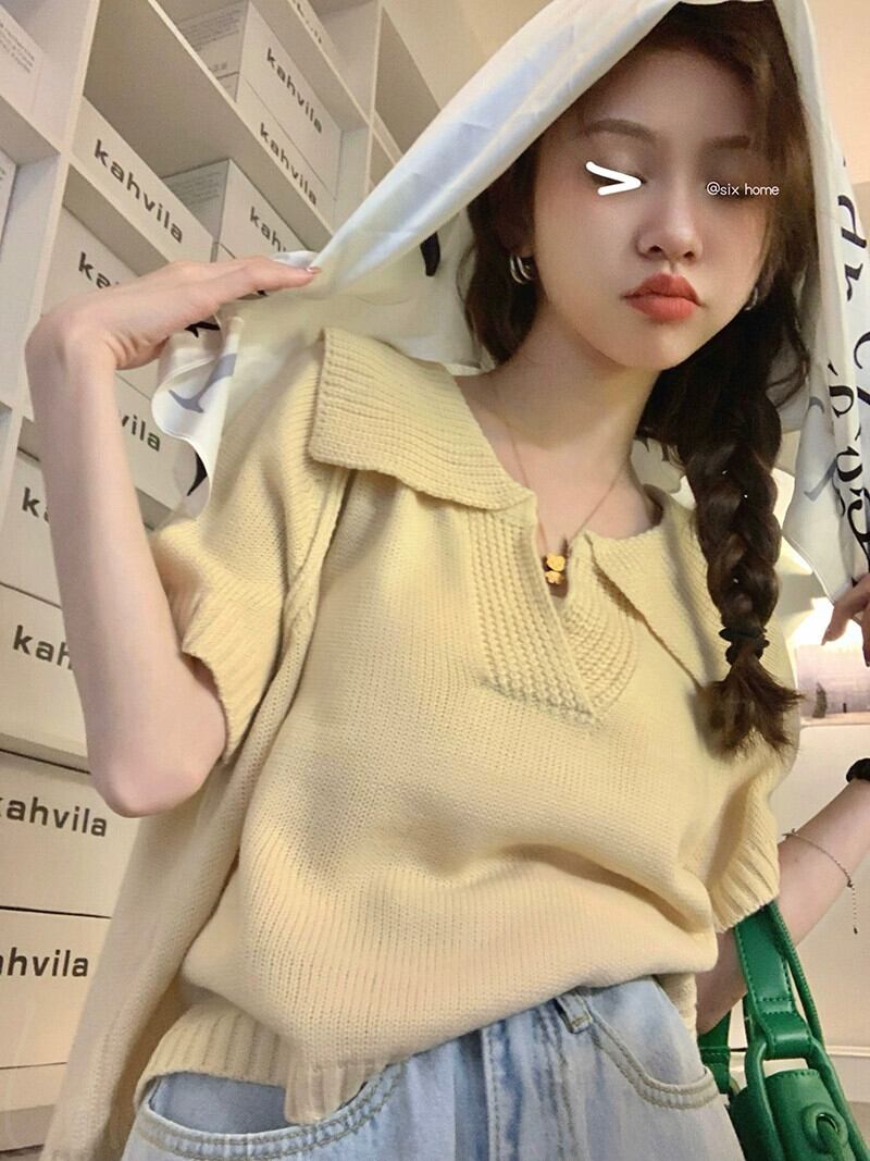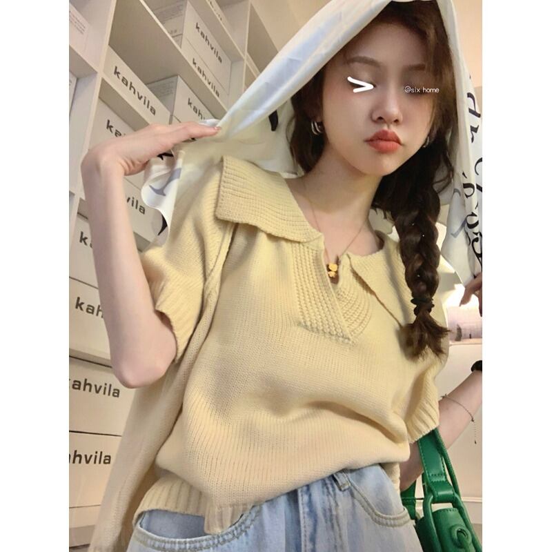 シックな薄いセクションのラペル半袖 T シャツの女性の夏の 2023 新しい短いセクションのルーズで薄いボトム シャツ トップのバージョン ショート サマー 夏物 Tシャツ 0921939556282382