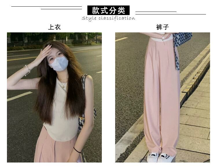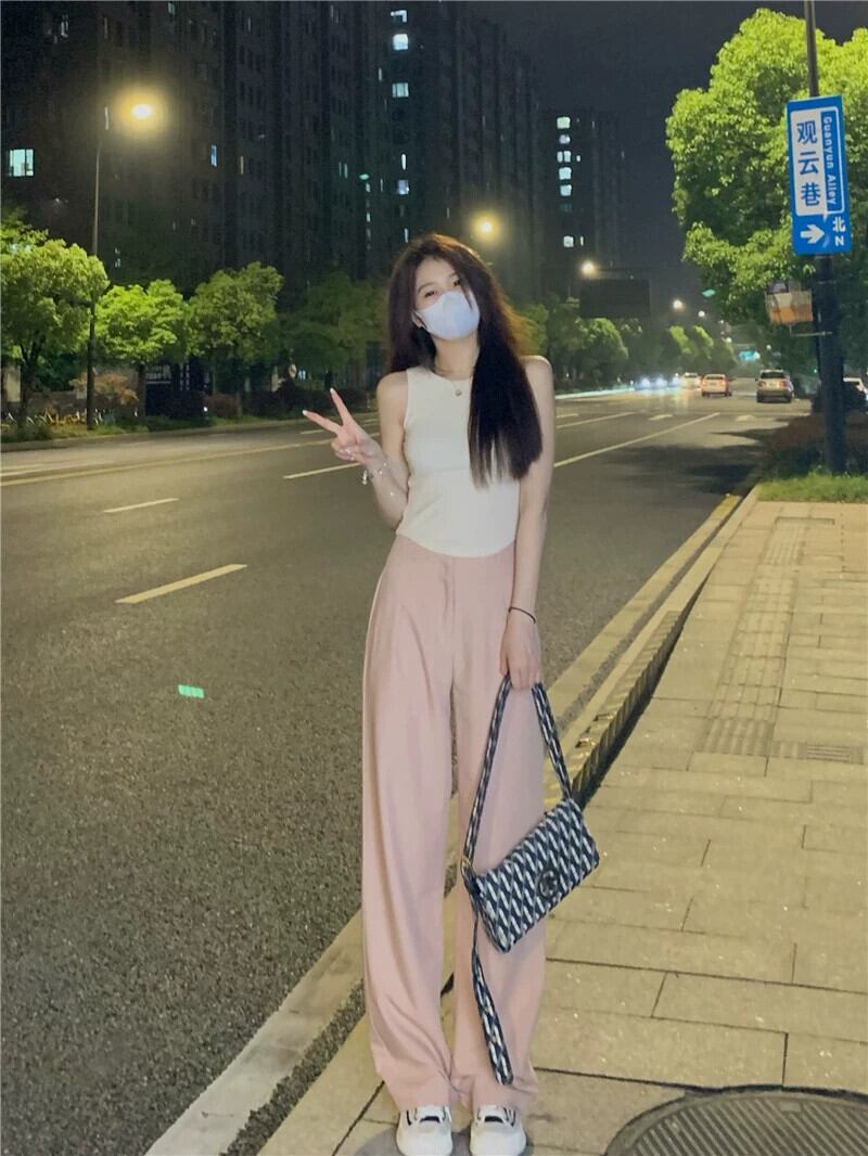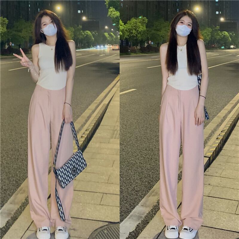 ピンクドレープスーツパンツレディースルーズストレートワイドレッグパンツ2023夏新しいオールマッチハイウエスト薄手カジュアルパンツ ハイウェスト サマー 夏物 0921941846895892
