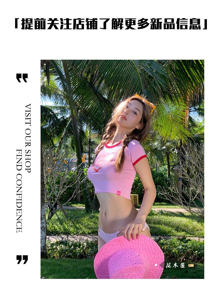 甘いピンクの愛のプリント半袖 T シャツの女性の 2023 夏の新しいスリム フィットと薄いショート クロップ トップ 大人ガーリー スウィート キュート カジュアル サマー 夏物 Tシャツ 092195842871176