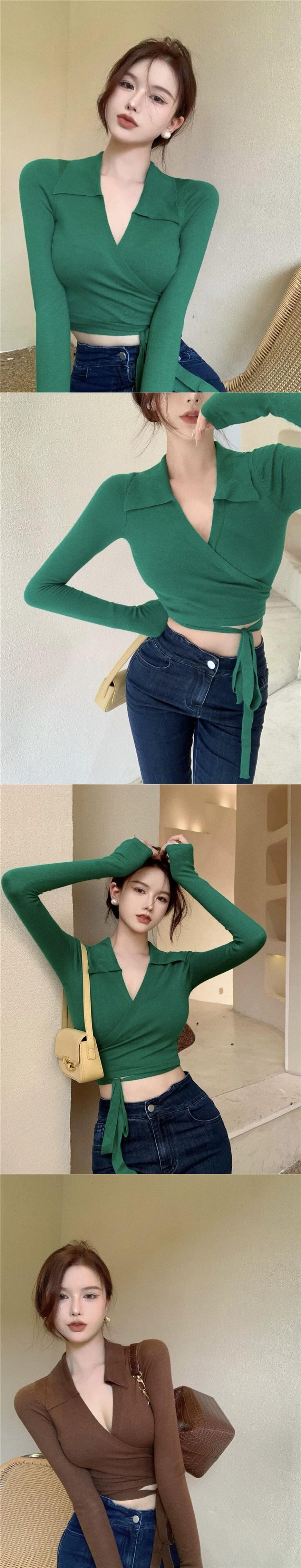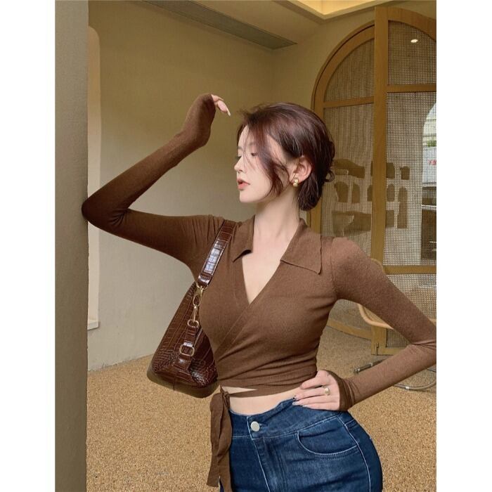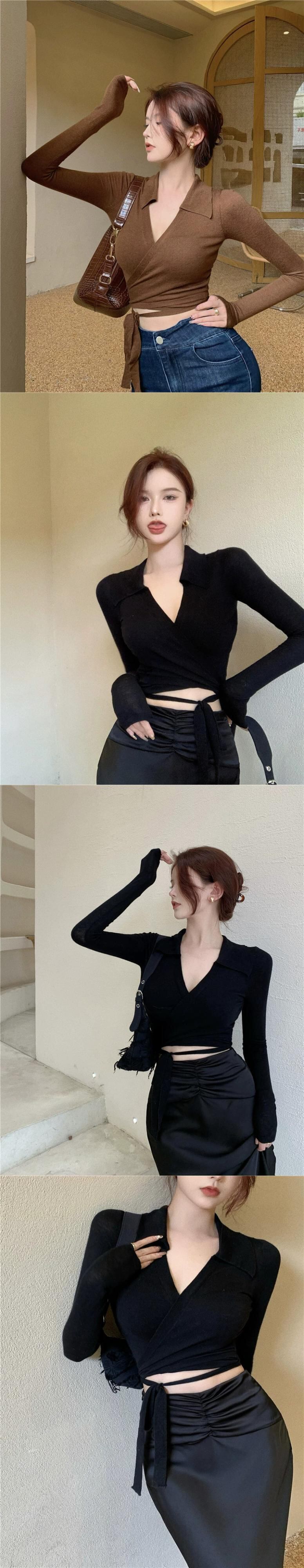 フランスの気質オールマッチ V ネックショート長袖ニットセーターレディース 2023 春の新作ウエストスリムストラップトップ ロング スプリング 春物 Vネック 092193432531119