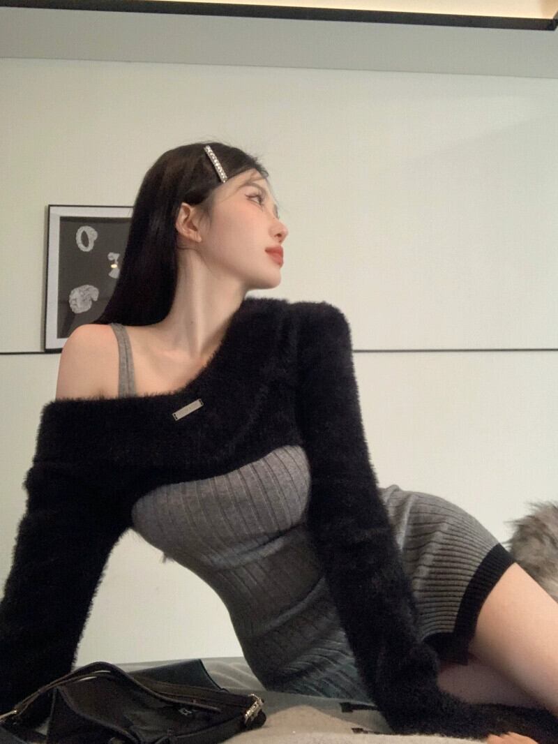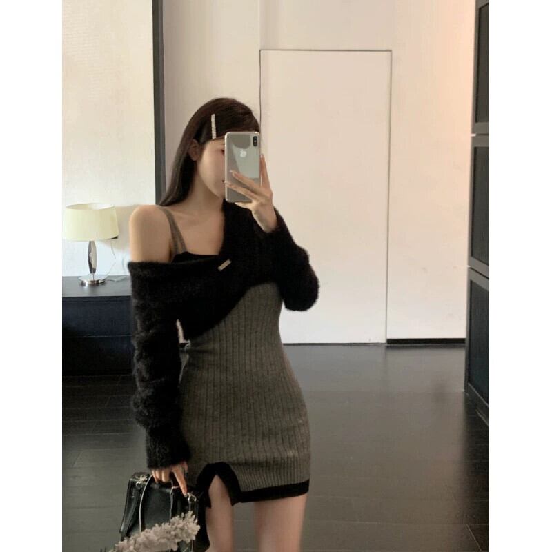 気質スリットサスペンダードレス女性の冬 2023 新しい自己修養スリムボトバッグヒップショートスカートトレンディな ウィンター 冬物 0921913795200236