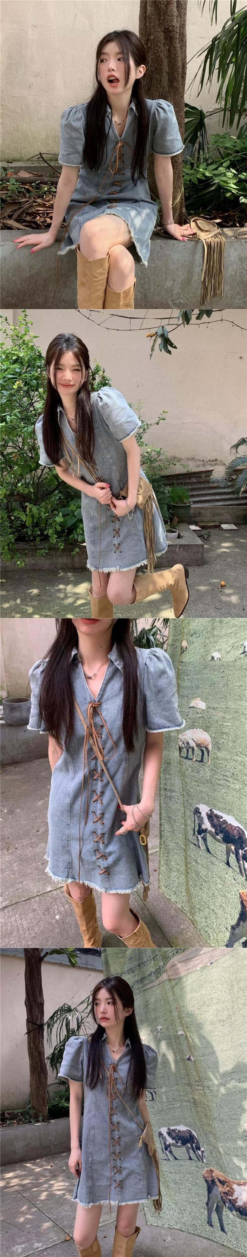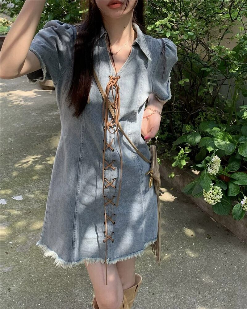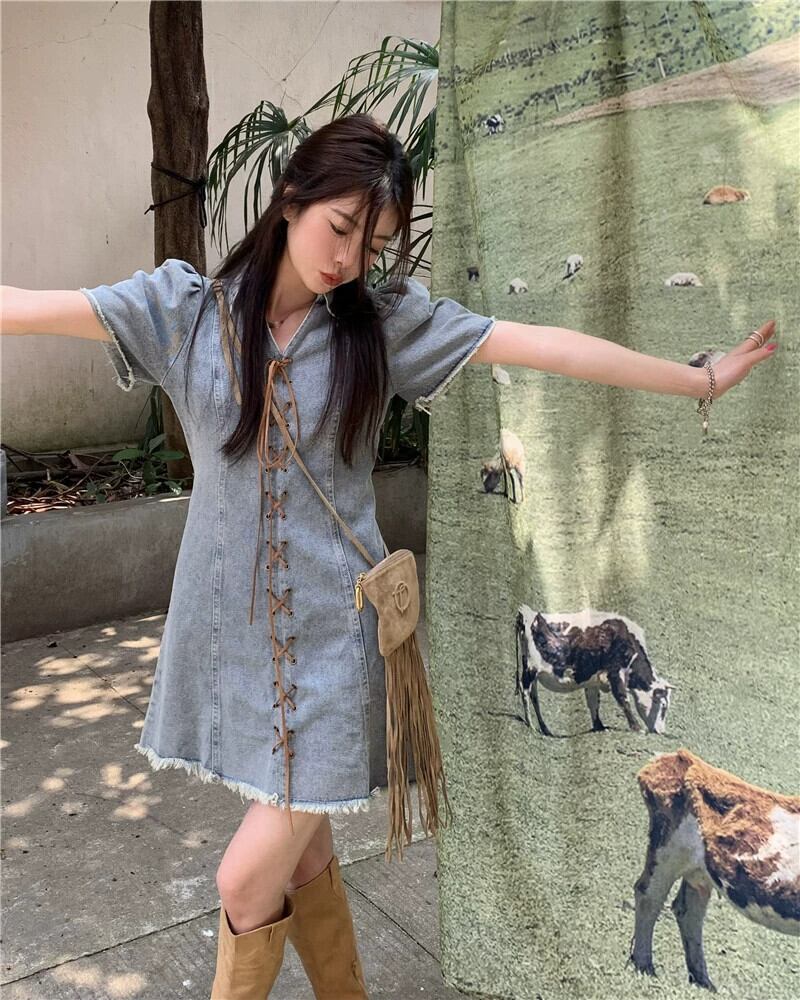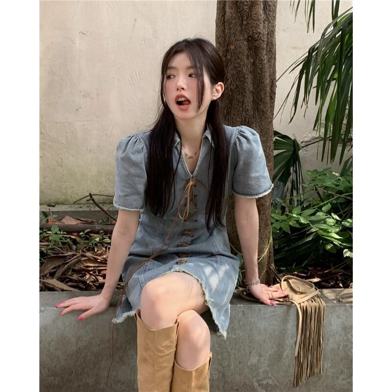 香港スタイルのレトロな半袖デニムドレスの女性の夏の 2023 新しいポロカラー気質ウエスト A ラインスカート サマー 夏物 Aライン 0921985681641949