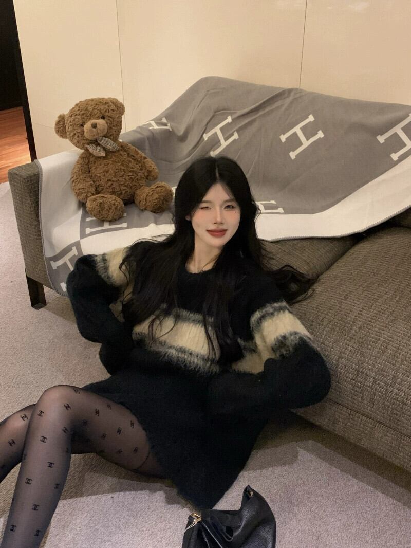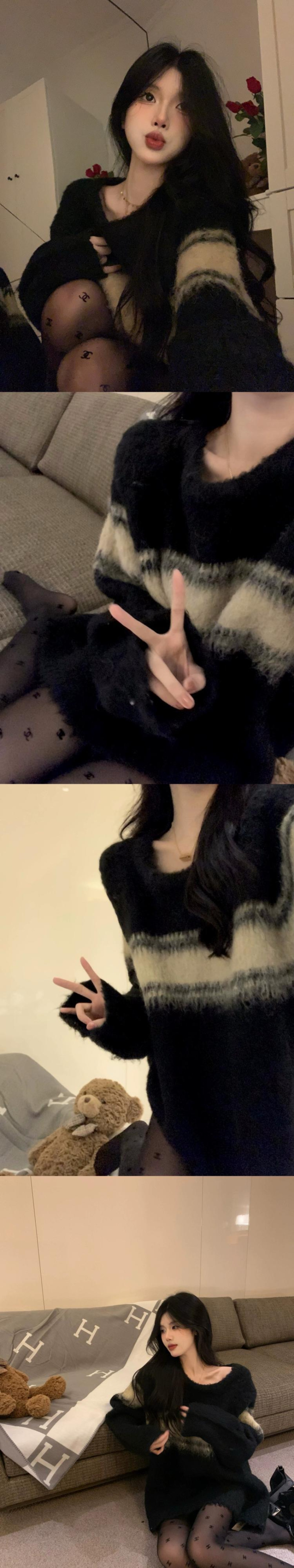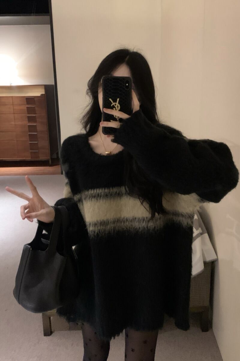 模造モヘア黒のストライプのルーズセーター女性の春と秋 2023 新しいオールマッチスリム長袖セータートップ ロング ブラック スプリング 春物 オータム 秋物 0921946233720719
