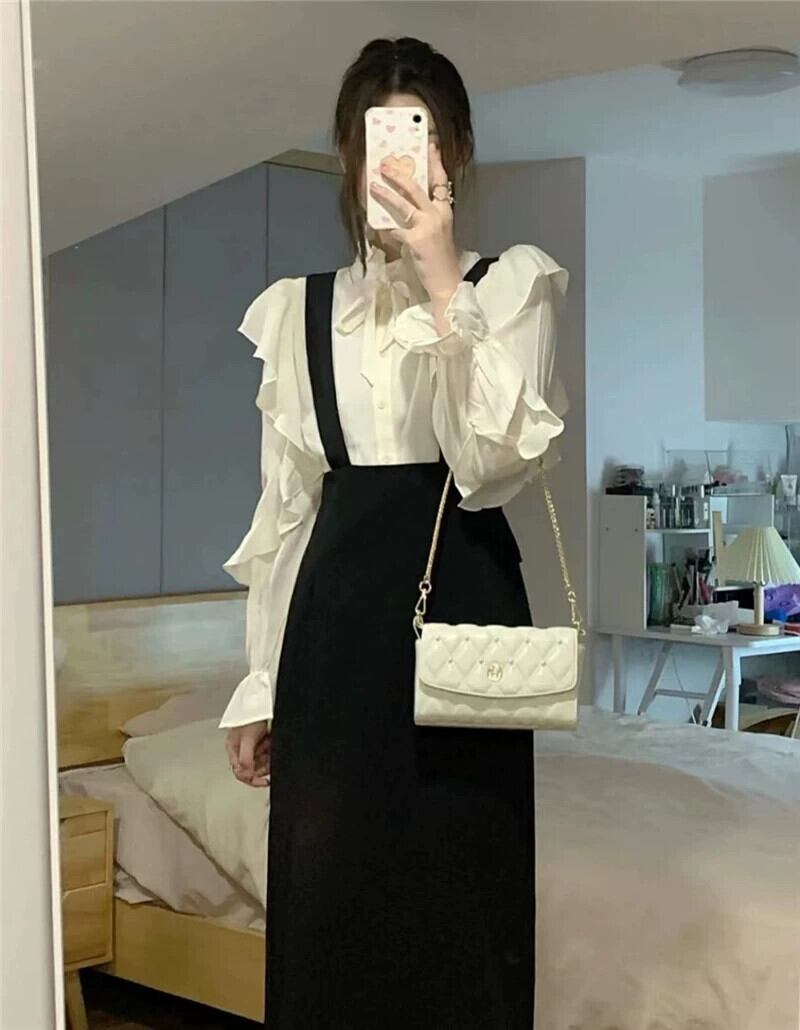 -終了フランスの気質スーツスカート女性 2023 春の新作フリルシャツストラップドレス 2 点セット スプリング 春物 0921948719297665
