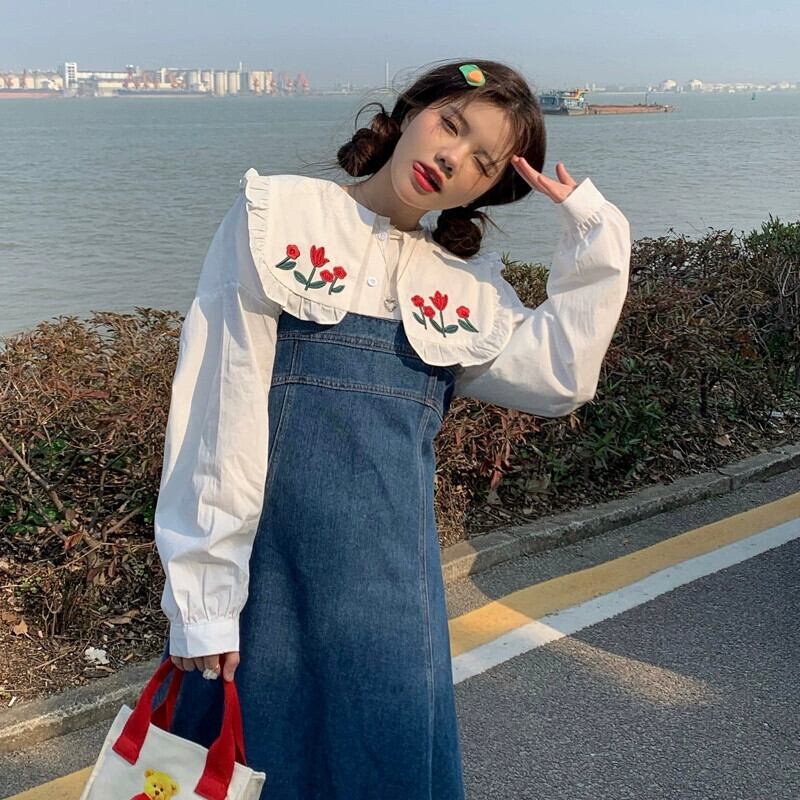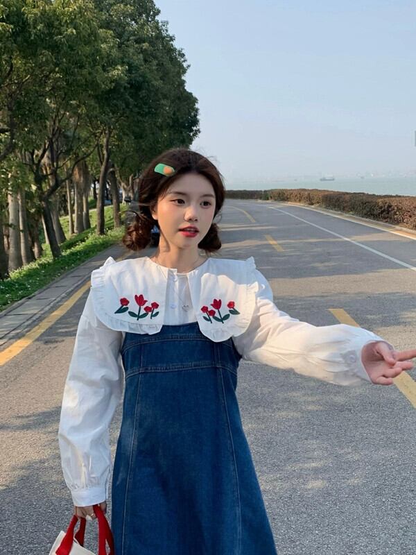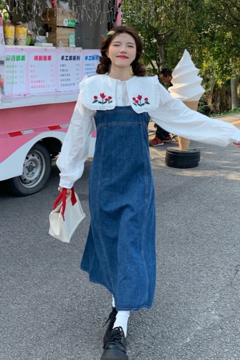 色:白い刺繍入りシャツ,デニムストラップドレス