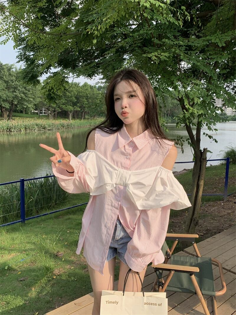 センスニッチちょう結び長袖シャツ女性の夏の 2023 新しいストライプストラップレスデザインセンスオールマッチシャツ ロング リボン サマー 夏物 0921963681245142