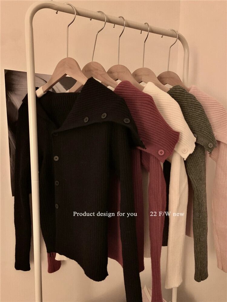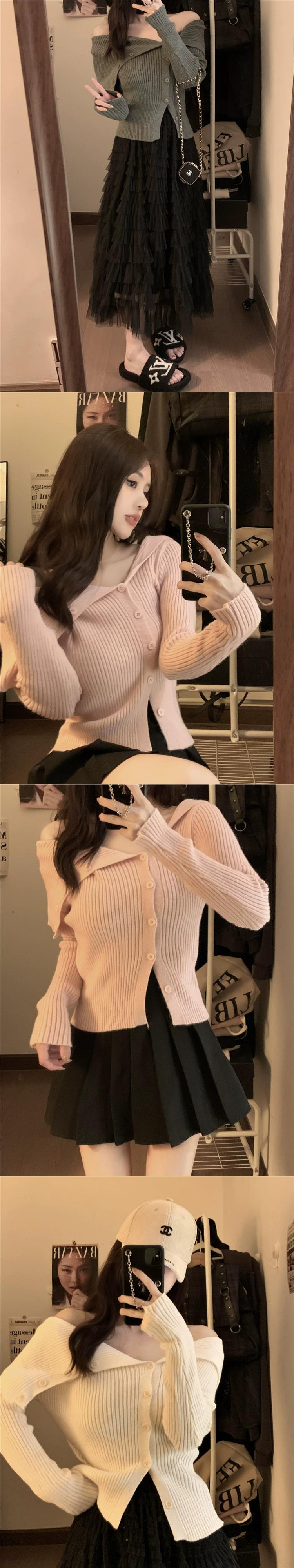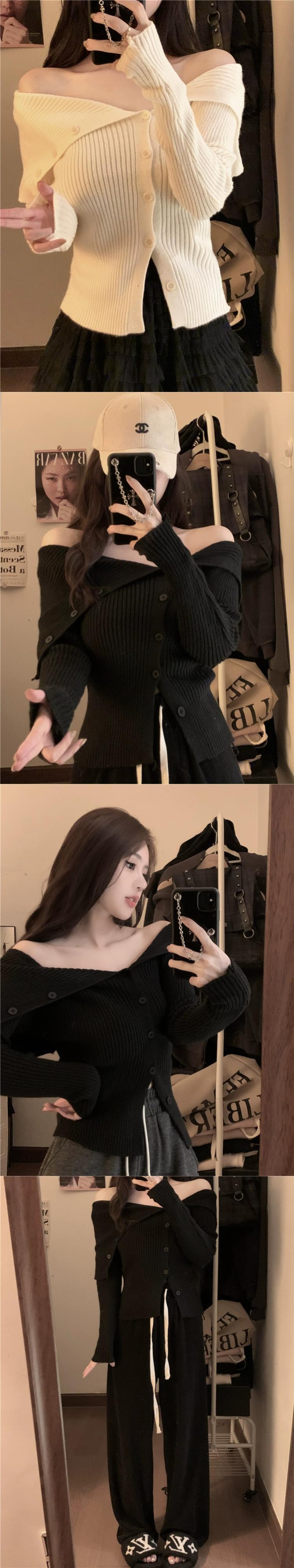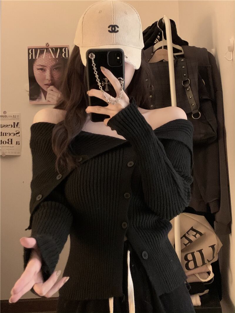 セクシーなオフショルダー長袖ボタンセーターカーディガン女性の2023春と秋の新しいデザインセンス痩身と薄いニットトップ ロング スプリング 春物 オータム 秋物 0921938720594798