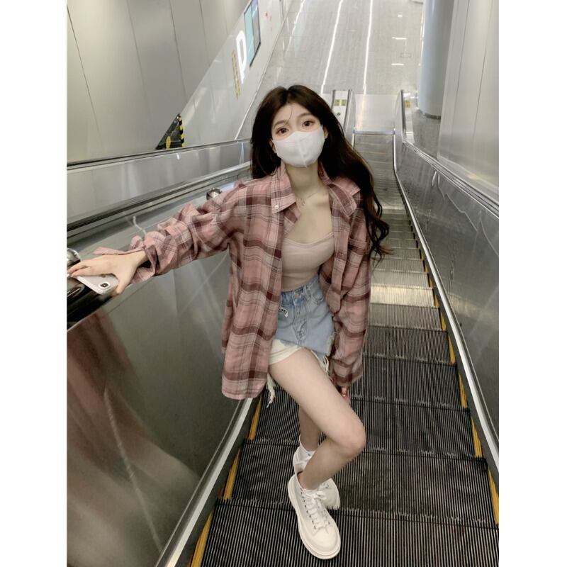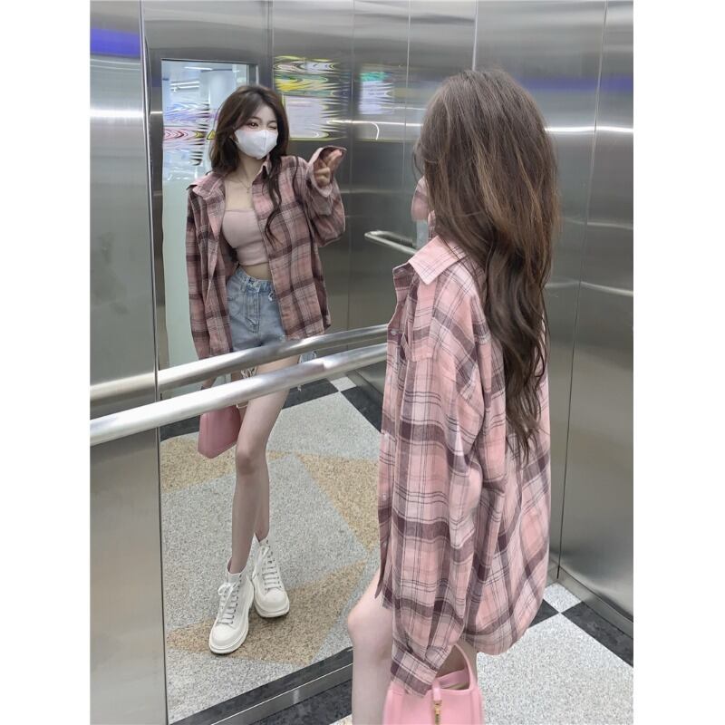 レトロ老化防止ピンクチェック柄日焼け止めシャツ女性の夏の 2023 新しい怠惰なスタイルルーズオールマッチシャツジャケット サマー 夏物 0921947975203479