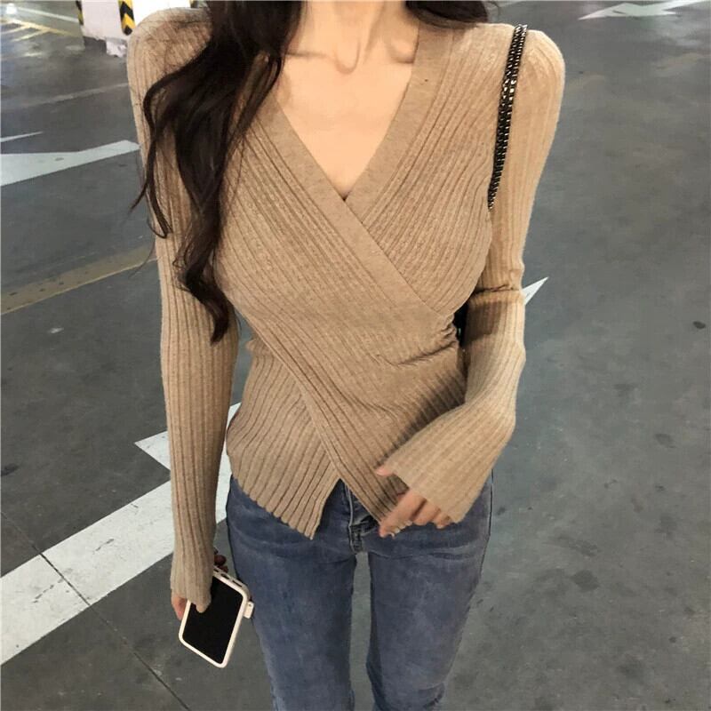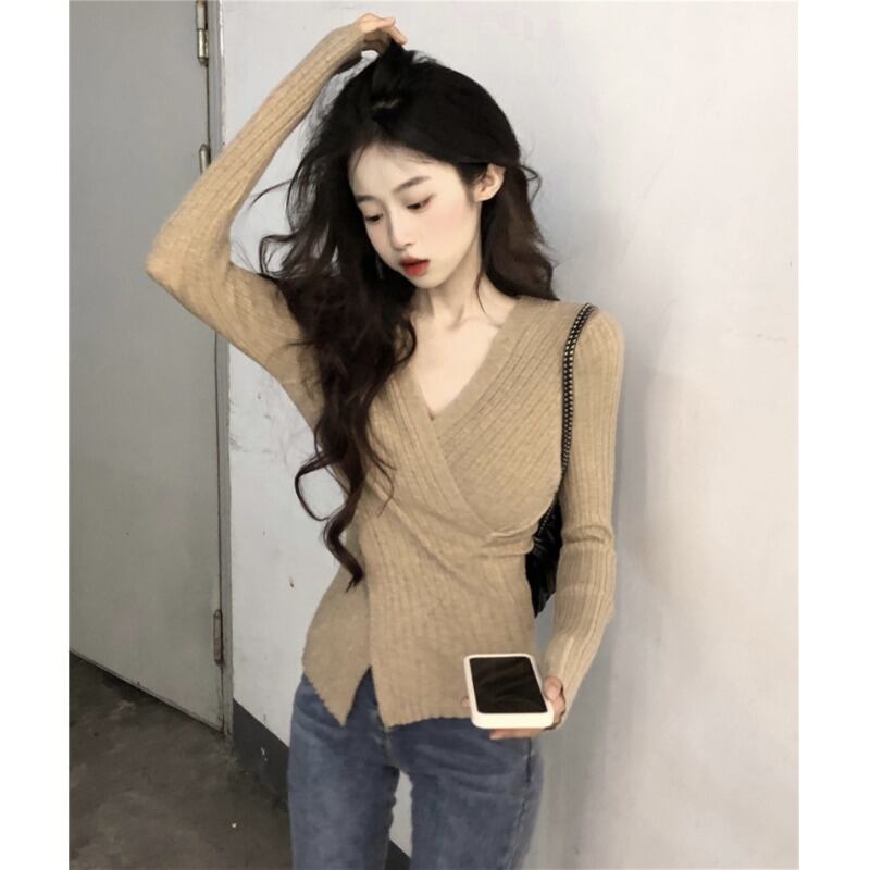 ニッチなデザインセンス不規則な V ネックニットセーターレディース 2023 夏の新作ショートセクションスリムスリムボトムストップ サマー 夏物 Vネック 0921956832676629