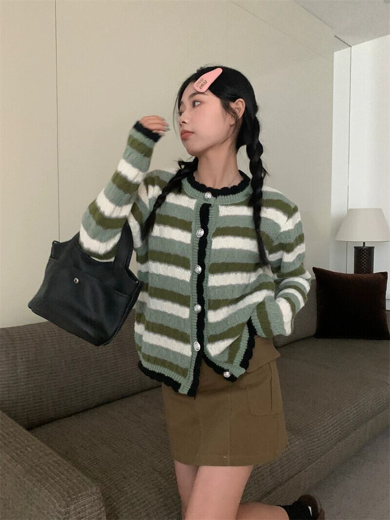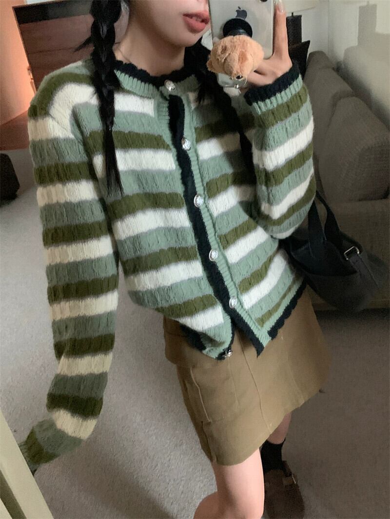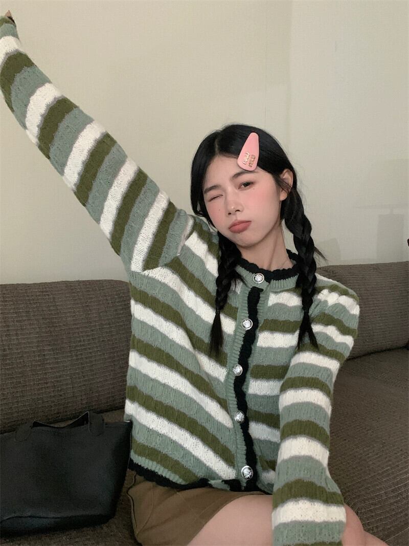 アメリカンレトロな小さな香りストライプ肥厚ニットカーディガン女性の春と秋の 2023 新しいショート薄いセータージャケット スプリング 春物 オータム 秋物 0921937892868932