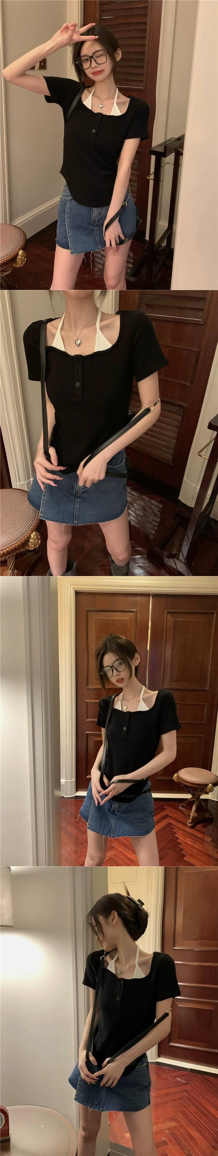 センスフェイクツーシックコントラストカラー半袖Tシャツレディース2023年夏新作不規則スリムスリムトップス サマー 夏物 0921931701134931