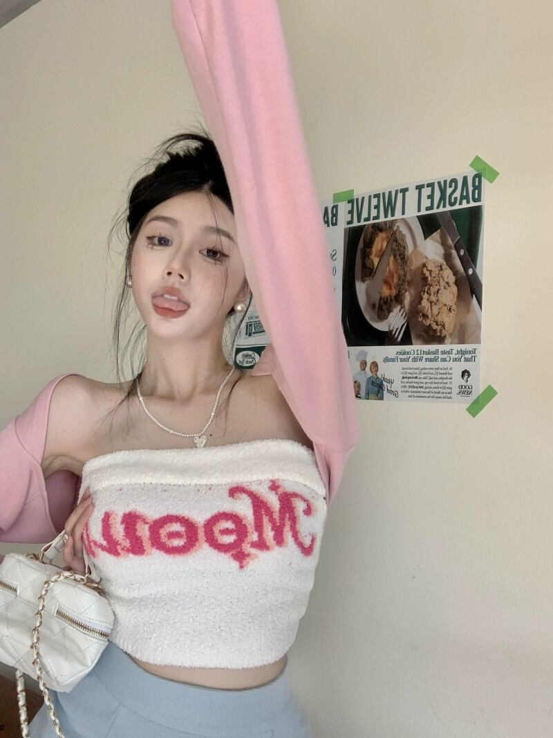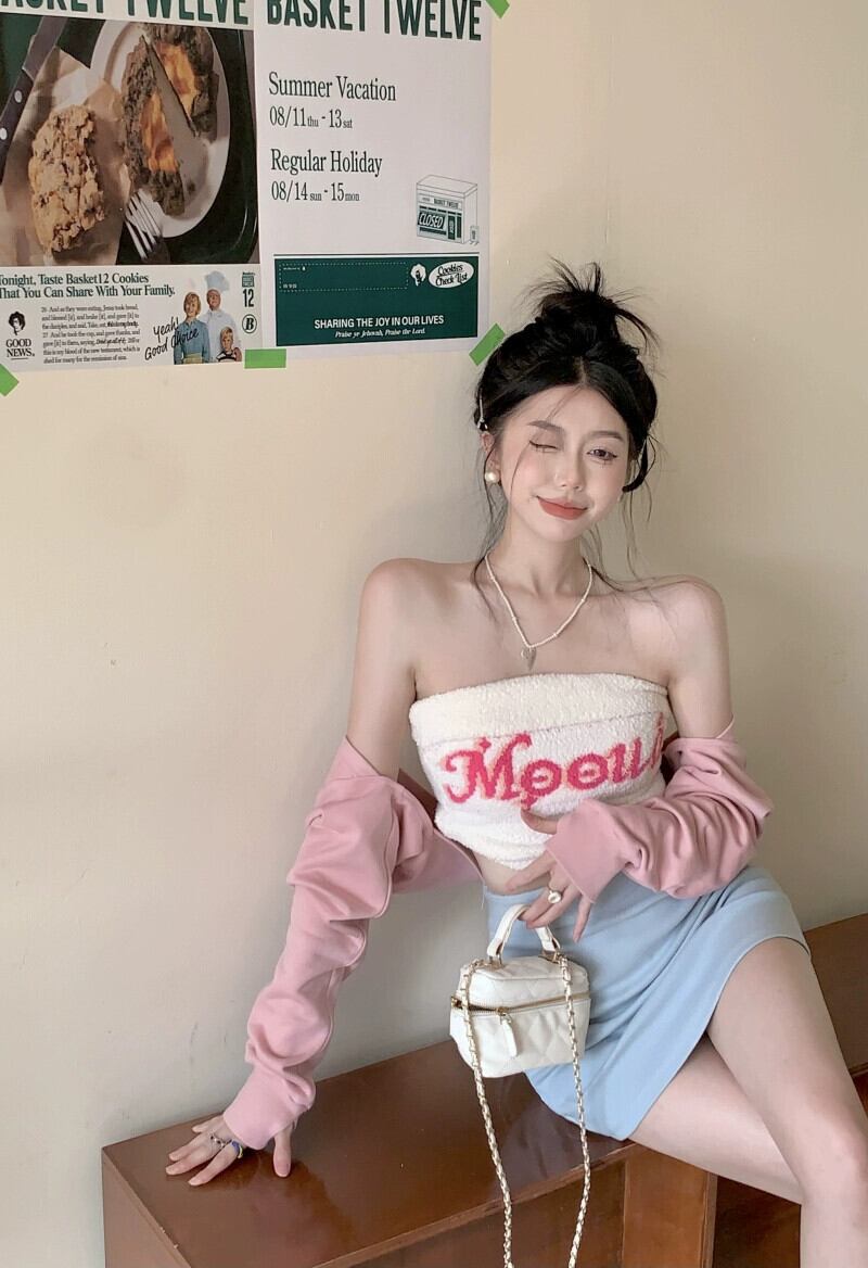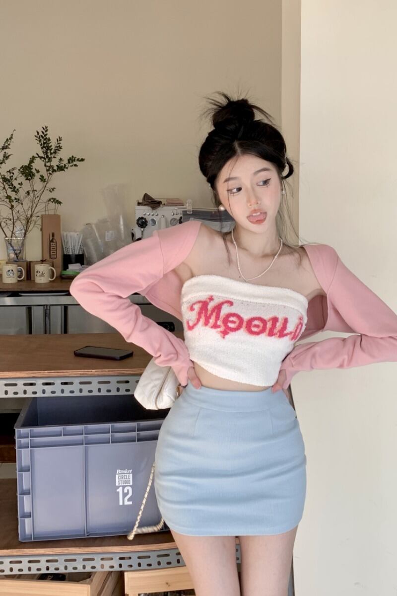 色:ピンクのカーディガン,白いチューブトップ,青いスカート