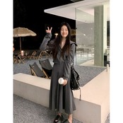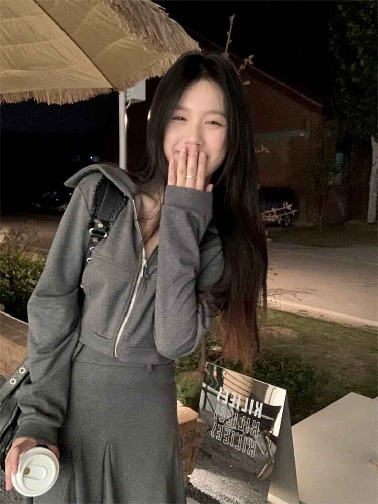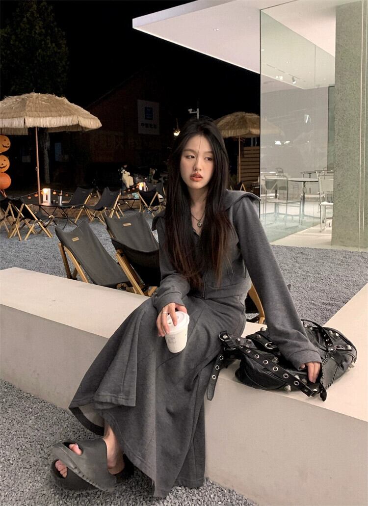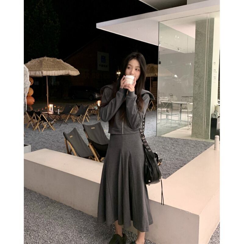 ダークグレーのスーツの女性の春の新しいジッパー長袖トップハイウエストプリーツスカート気質ツーピーススーツのバージョン ハイウェスト ロング スプリング 春物 092194819787297
