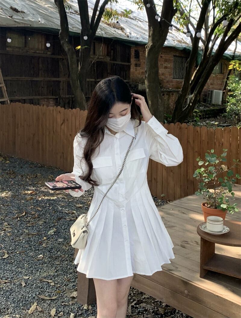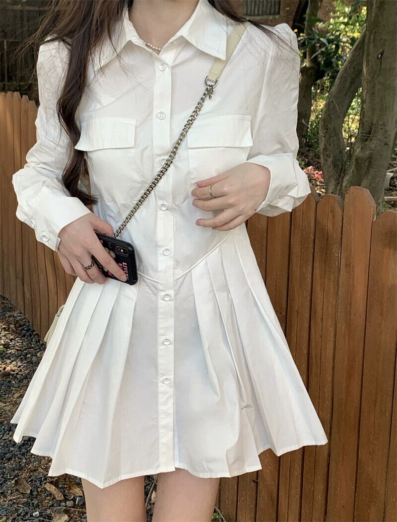 シックな甘辛の白いシャツドレスの女性の夏の 2023 新しい気質ウエスト痩身プリーツスカートのバージョン ホワイト 大人ガーリー スウィート キュート カジュアル サマー 夏物 0921959015423435