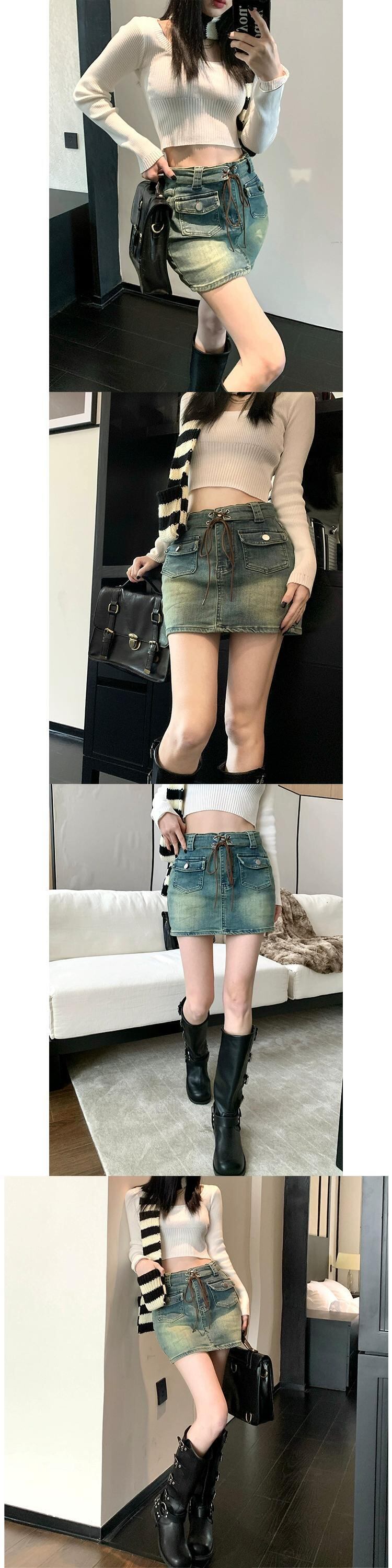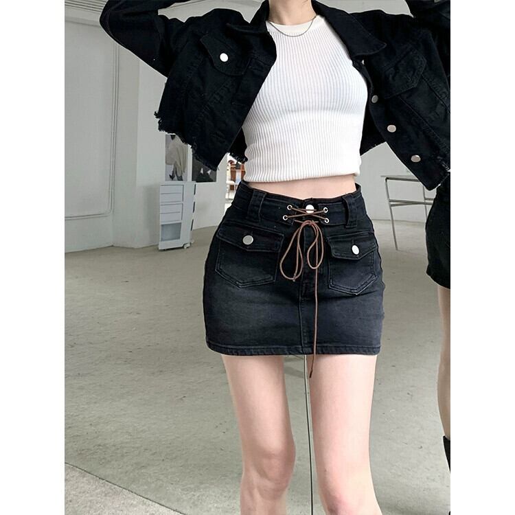 レトロなデザインのレースアップデニムスカートの女性の夏の 2023 新しいハイウエストスリムバッグヒップキュロット潮 ハイウェスト サマー 夏物 0921977364572651