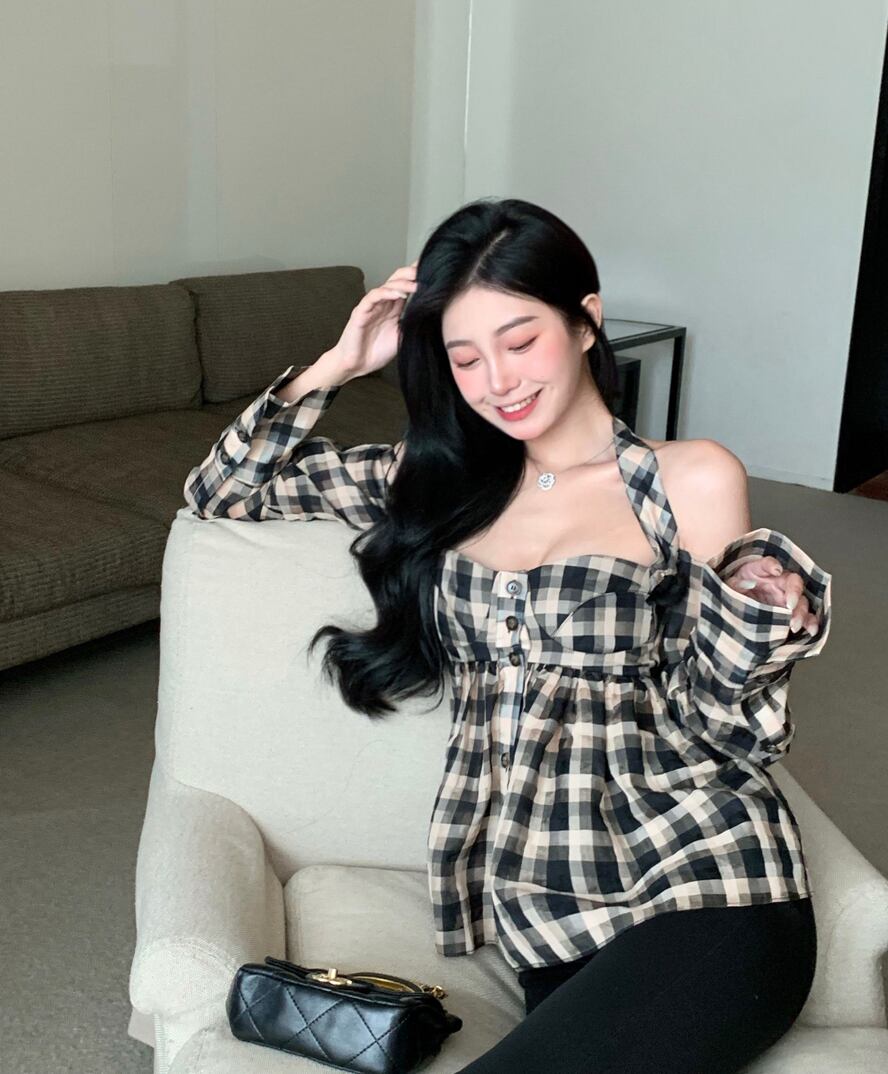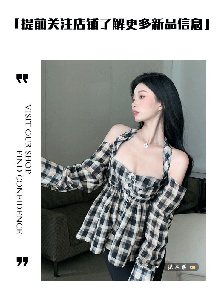 スパイスヒットカラーホルターネックチェック柄シャツ女性の夏のデザインセンスニッチシャツセクシーな純粋な欲望風ストラップレストップ サマー 夏物 ピュア 0921938680995177
