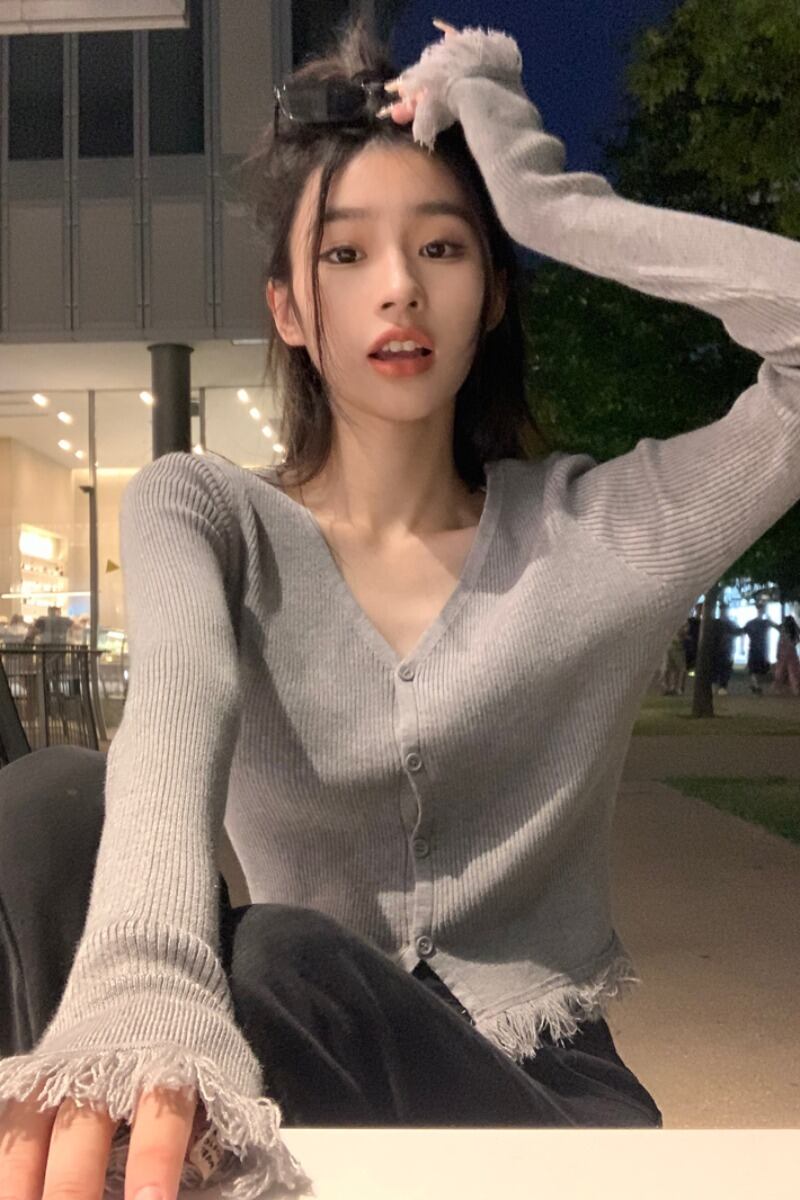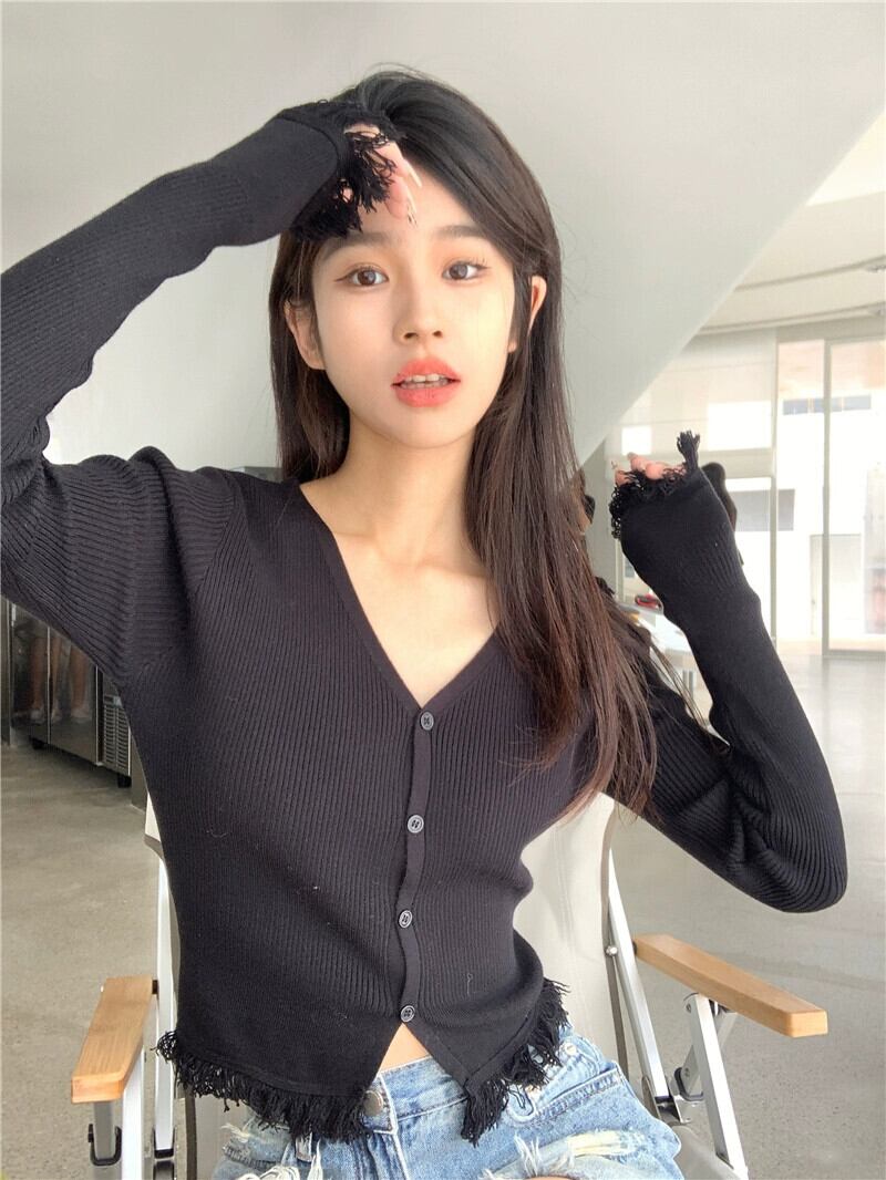 スタイルシックなフリンジ無地 v ネック長袖ニットセーター女性の春 2023 新しいスリムフィットショートカーディガントップ ロング スプリング 春物 Vネック ソリッドカラー 0921924057258649