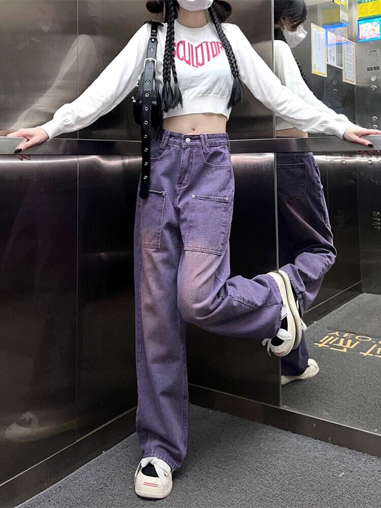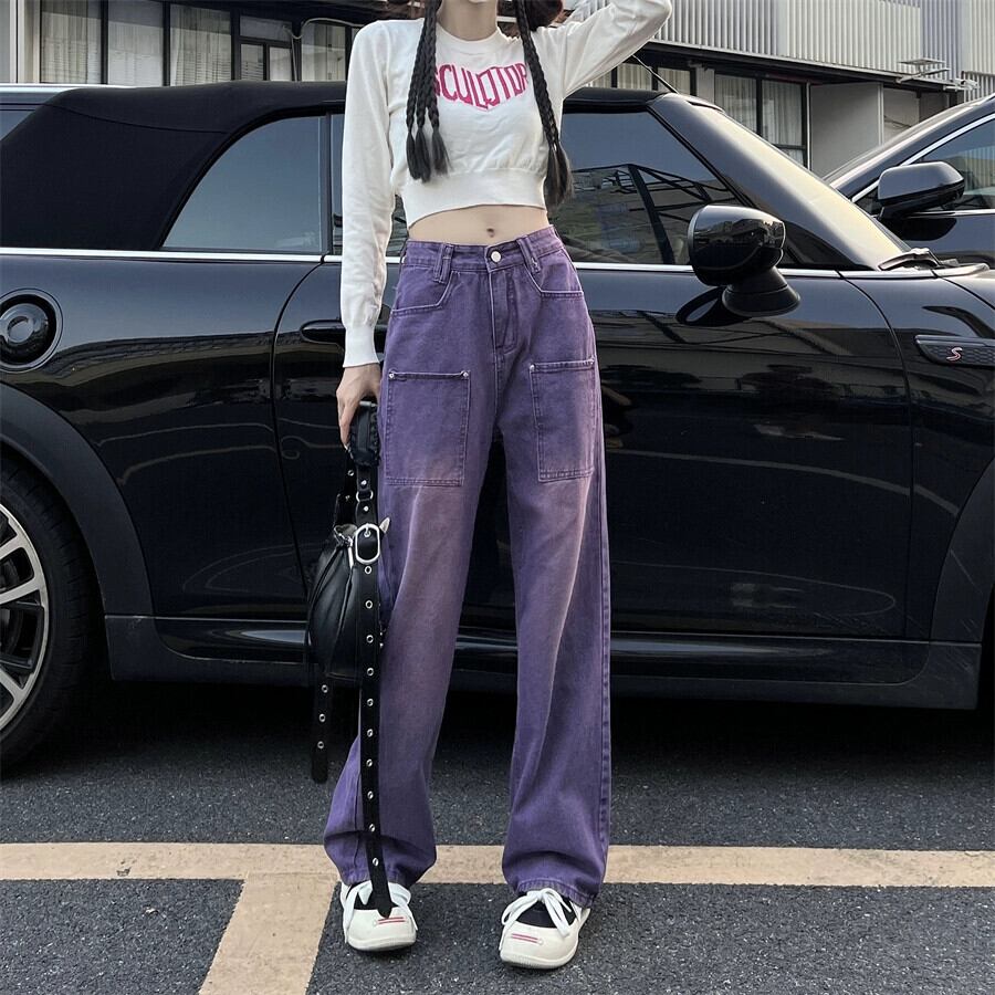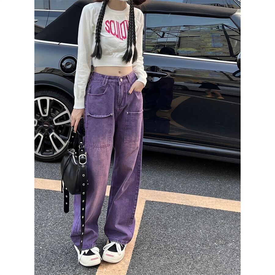 アメリカンフライドストリート製オールドウォッシュパープルジーンズレディース2023年夏新作シックなハイウエストストレートパンツ潮 ハイウェスト サマー 夏物 0921986664711518