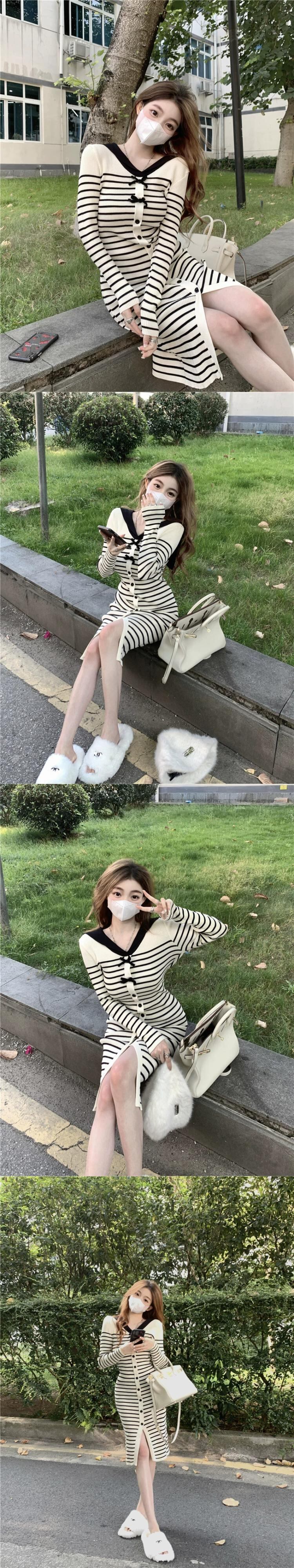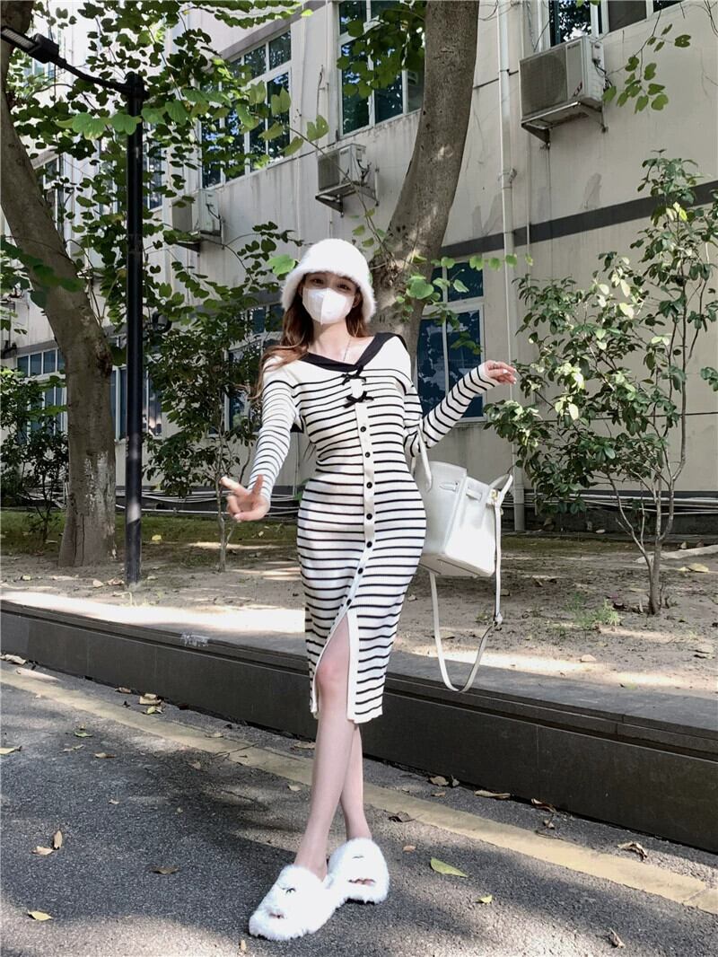 年齢を減らすバージョンのカラーコントラストラペルドレスレディース2023年春の新しいミッドレングスのボウノットストライプヒップスカート リボン スプリング 春物 0921998184427475