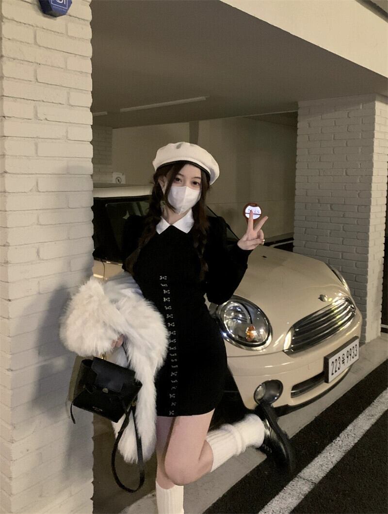 ホットスタイルパフスリーブ黒と白のカラーコントラスト長袖ドレス女性の春と秋の2023新しいスリムベルベットスカート ロング ホワイト ブラック スプリング 春物 オータム 秋物 0921911027498685