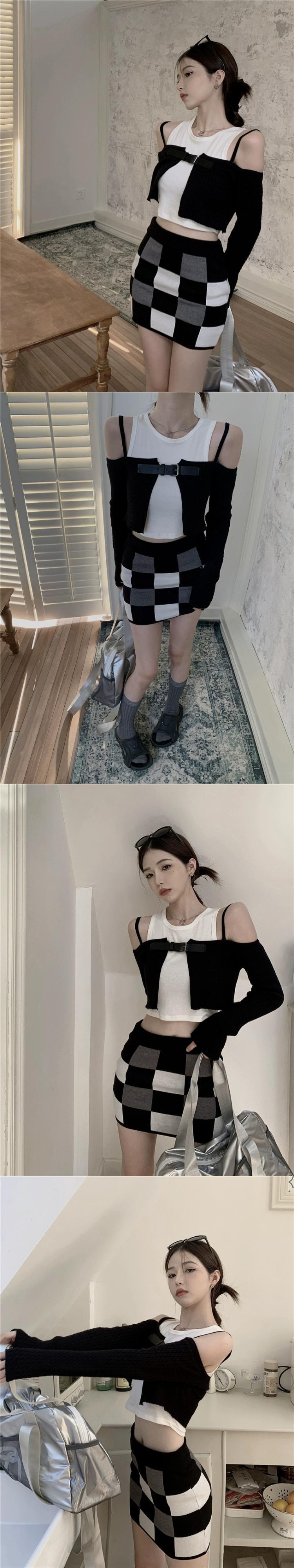 色:ピンクカーディガンワンピース,ブラックカーディガンワンピース,ピンクのチェック柄スカート,黒のチェック柄スカート,白いベストワンピース