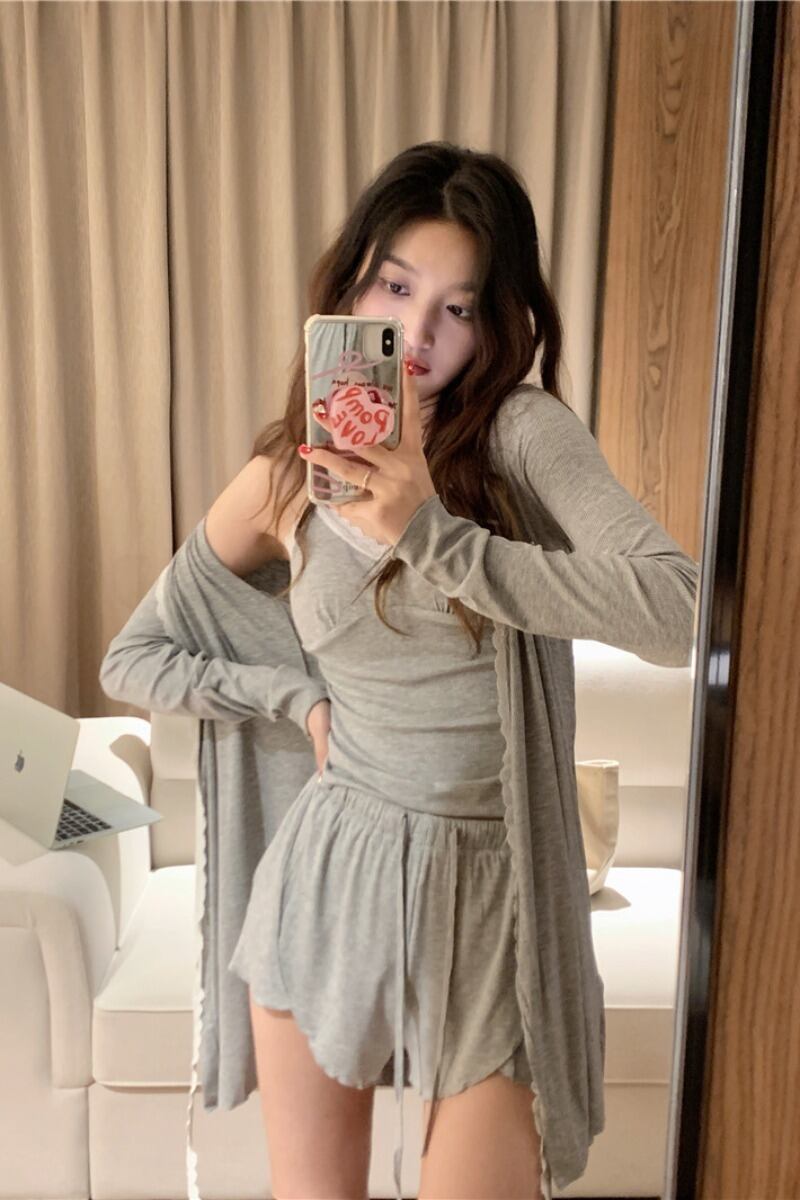 グレー カーディガン パジャマ セット 春 V ネクタイ 胸パッド サスペンダー パジャマ ショーツ 外出着 ホームサービス 3 点セット スプリング 春物 ブルマー 0921971498305291